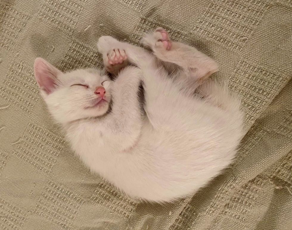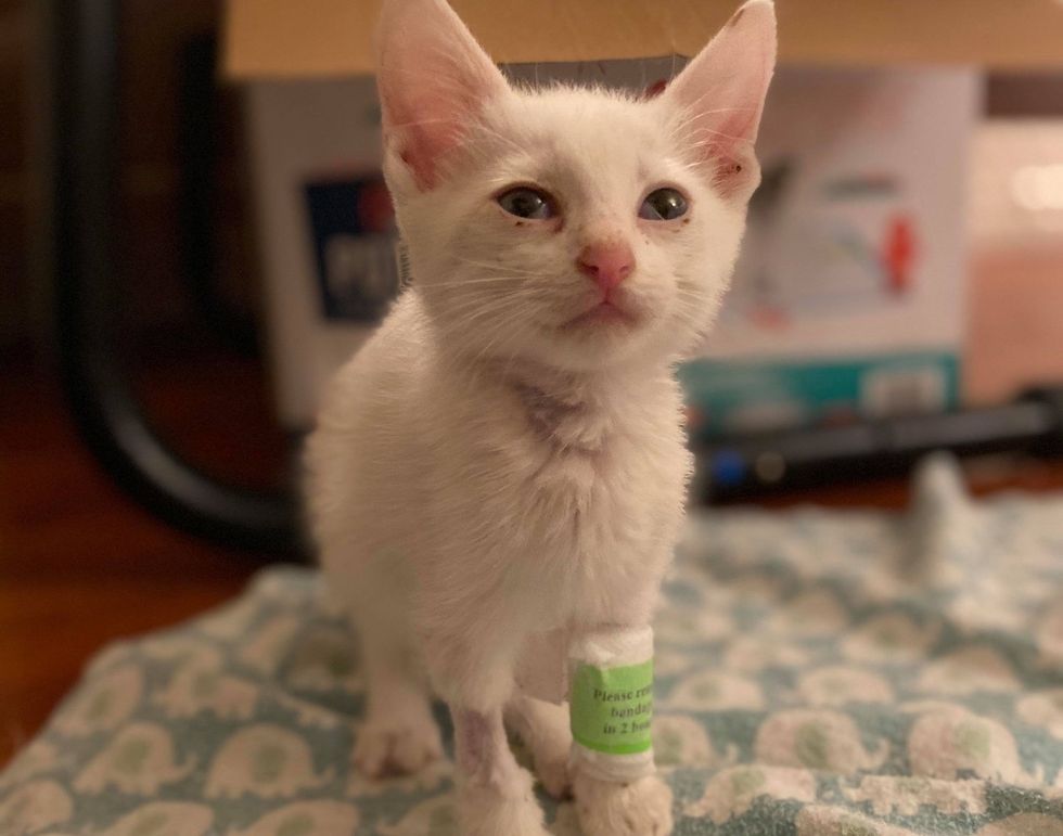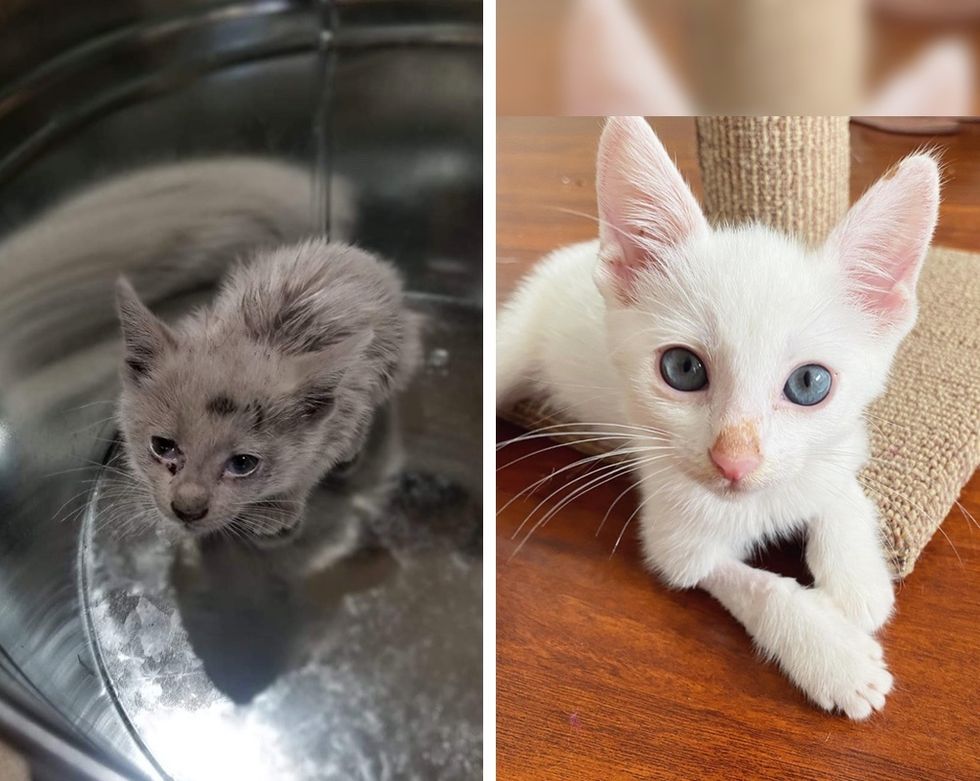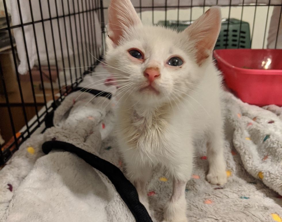 The little guy completely transformed into a kitten with white fur. When he arrived in foster care the next day, they quickly discovered that he had a host of health issues.