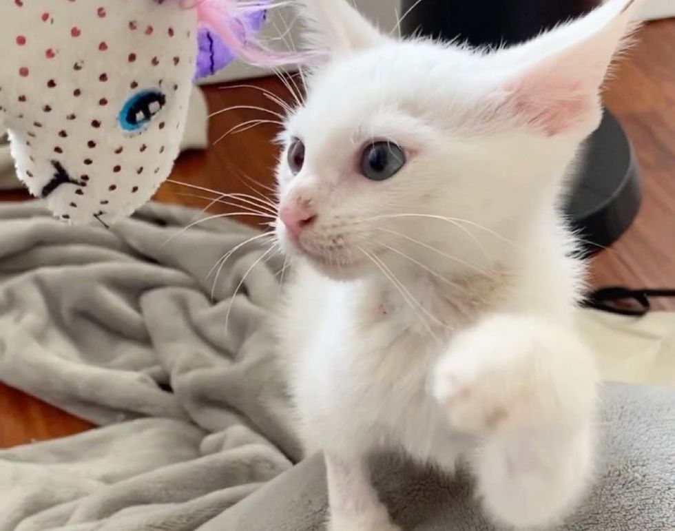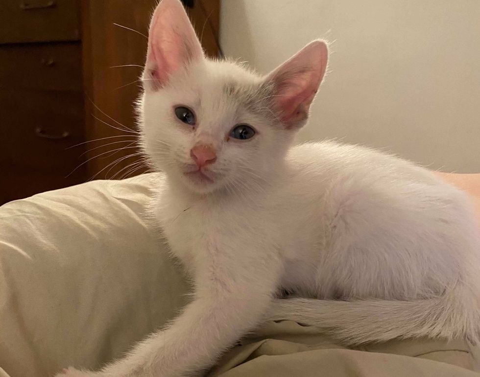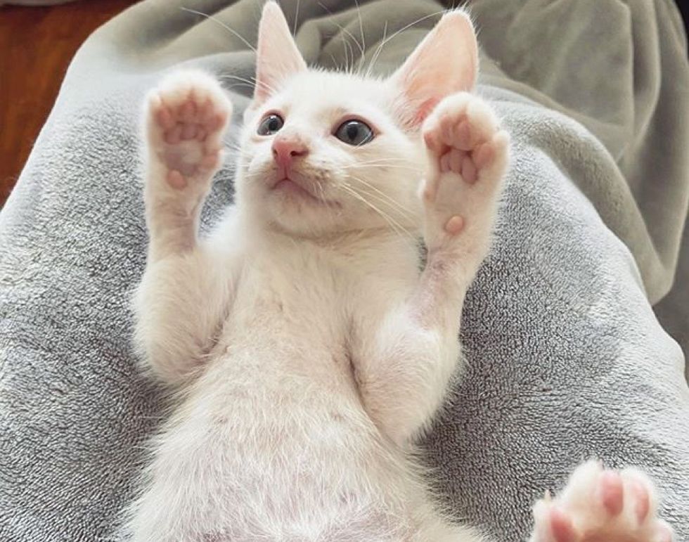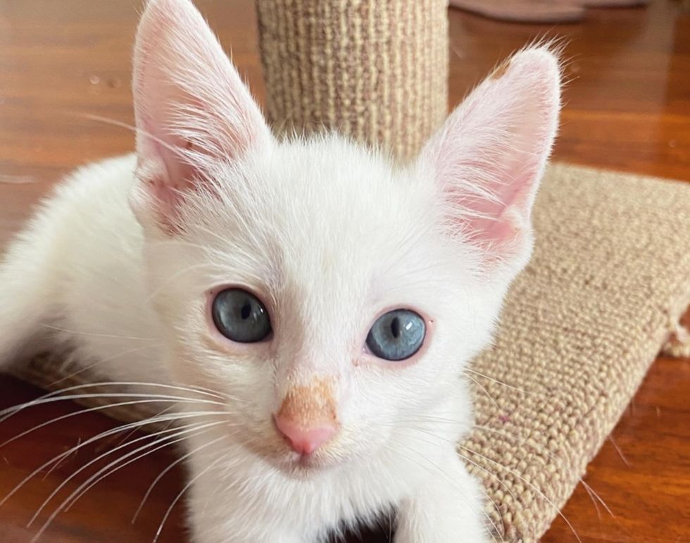 The kitten with blue eyes and white fur turned out to be deaf in both ears. But he can do anything just like other cats, and he lets nothing stop him.