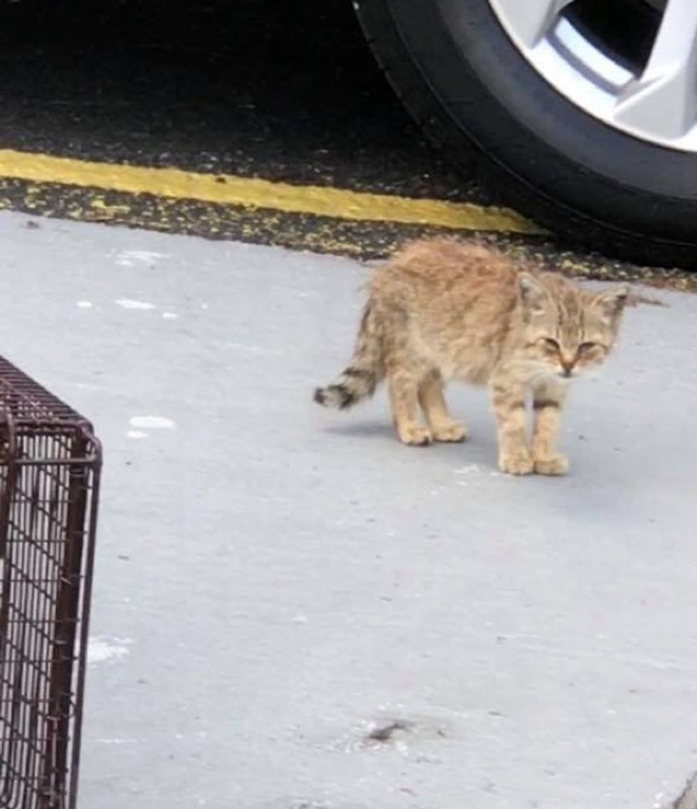 The scrawny little tabby was in rough shape and needed immediate medical attention. She ran under a car nearby but didn't go far. Carmen set a humane trap with food inside right by the vehicle.