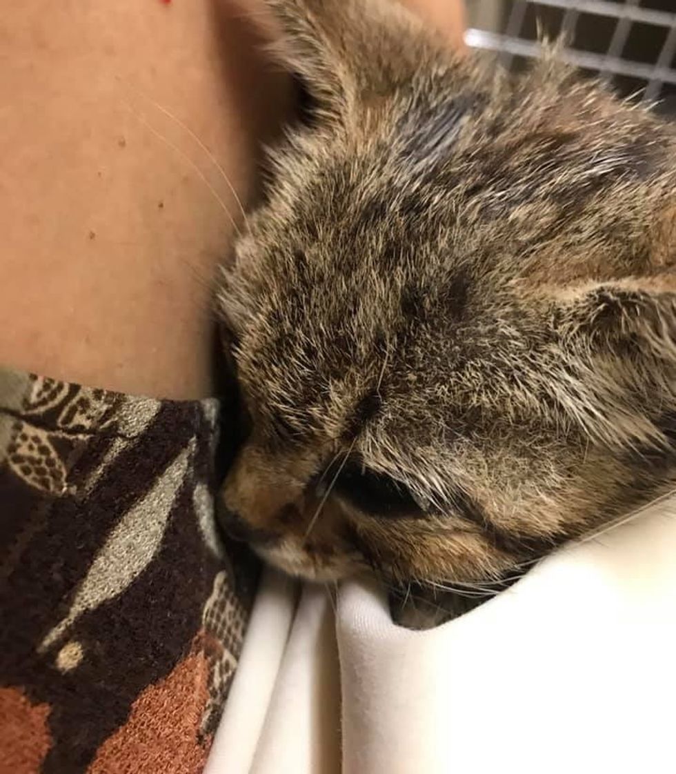 The tabby girl was so grateful to have someone to care for her. She cuddled right up to Carmen.