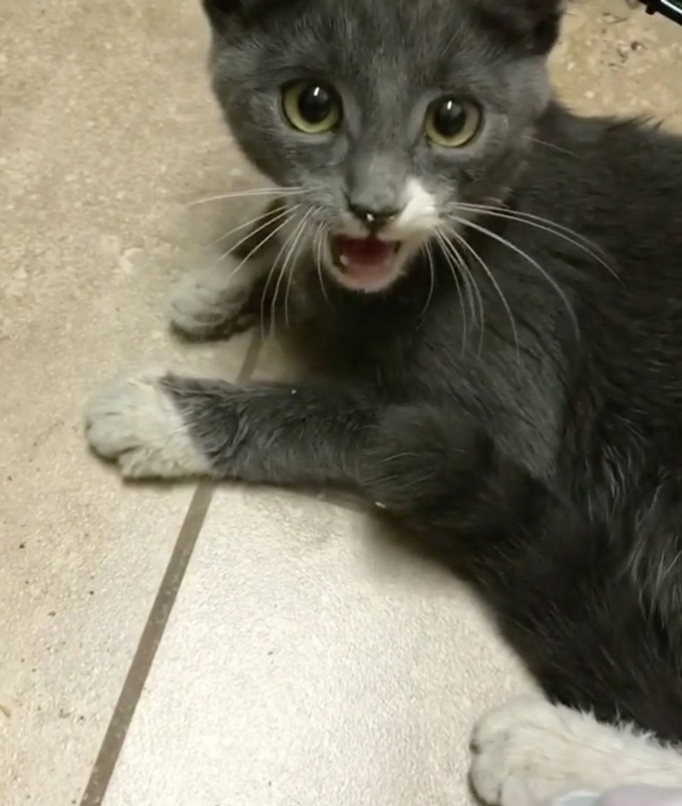 "The kitten was extremely dehydrated, much smaller than normal," Ellen told Love Meow. "They came from the backroom with a shallow box, full of twigs and leaves. I saw a kitten's head pop up, thinking she would jump, but she just laid there."
