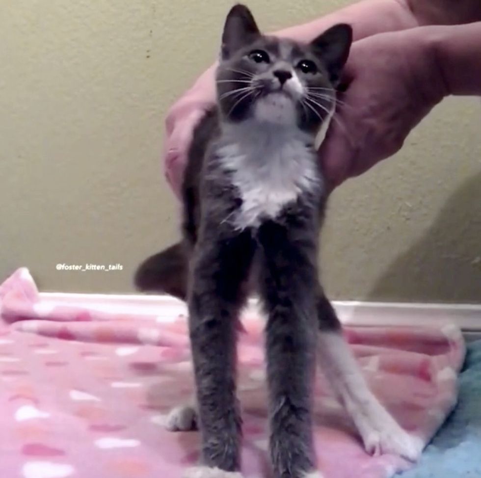 A few weeks old, Tiny could barely move her legs, but now she can jump, run and play just like any other kitty. She loves to follow her human around the house and doesn't want to be alone any more.