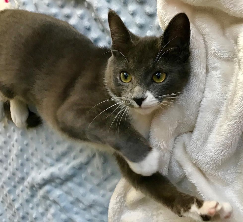 Overnight, the hissy, semi-feral kitten (whom they named Tiny) had turned into a friendly, purring kitty who loved people and wanted to be held. "When I went to pick her up, the vet tech came into the room, out of her pocket came Tiny. She was purring, standing with help, and loved being petted."