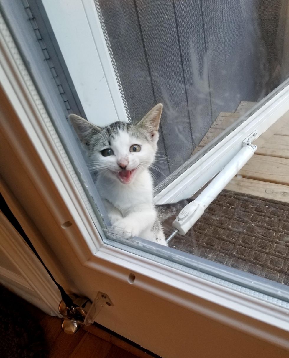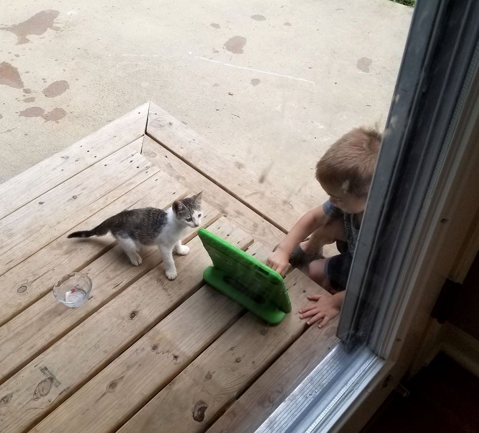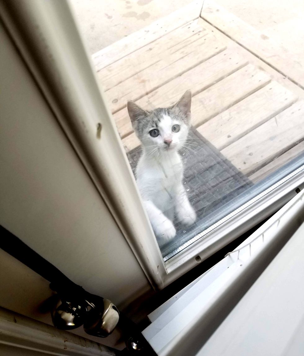 The kitten visited their yard several times a day for food and started moving to the window to peek in and let the family know that she had arrived.