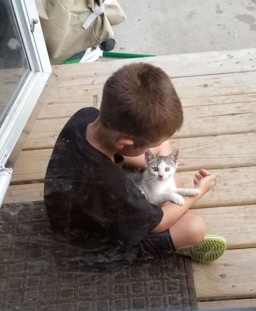 The sweet kitten quickly bonded with Ariel's son and would play with him when they were out in the yard together.