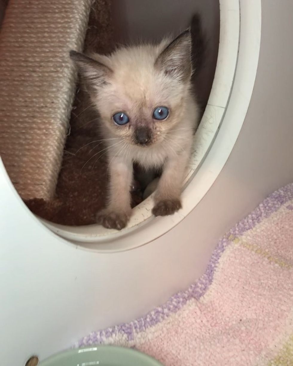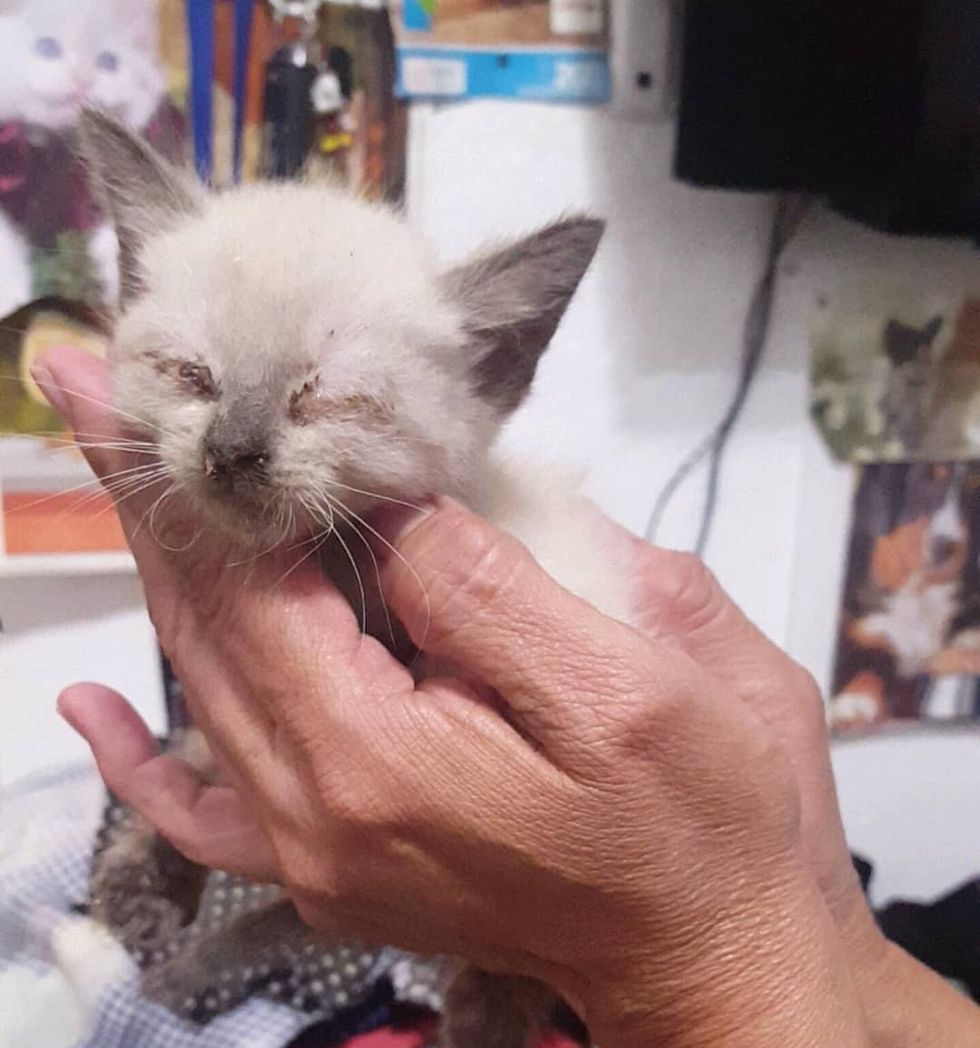 Her eyes were crusted shut due to a severe upper respiratory infection. She was so hungry that she scarfed down all the food she was given to make up for the lost meals. After getting her eyes and face cleaned and treated with medication, the kitten could finally rest that night.