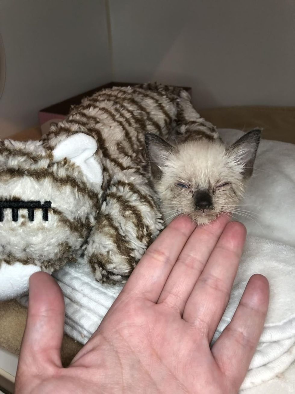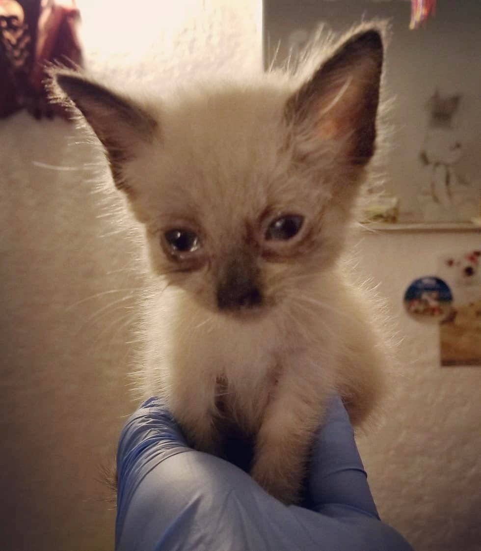 She named her Sugarbug. The kitten was very small and weak, weighing only 0.6 pounds (272 grams). Nikki immediately started syringe-feeding her and treating her infection with antibiotics. "I fed her a mixture of kitten food made into 'soup' to keep her hydrated, and supplemented her with nutritional gel formulated for kittens."
