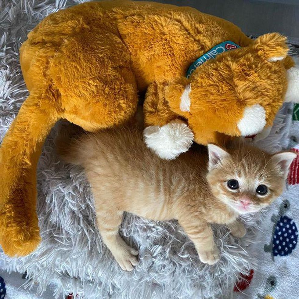 Winnie was gifted a few faux mommas (plush toys) to keep her company at nap time. She would snuggle up to a cuddle buddy or lie on her back and bench-press her toy as she purred herself to sleep.