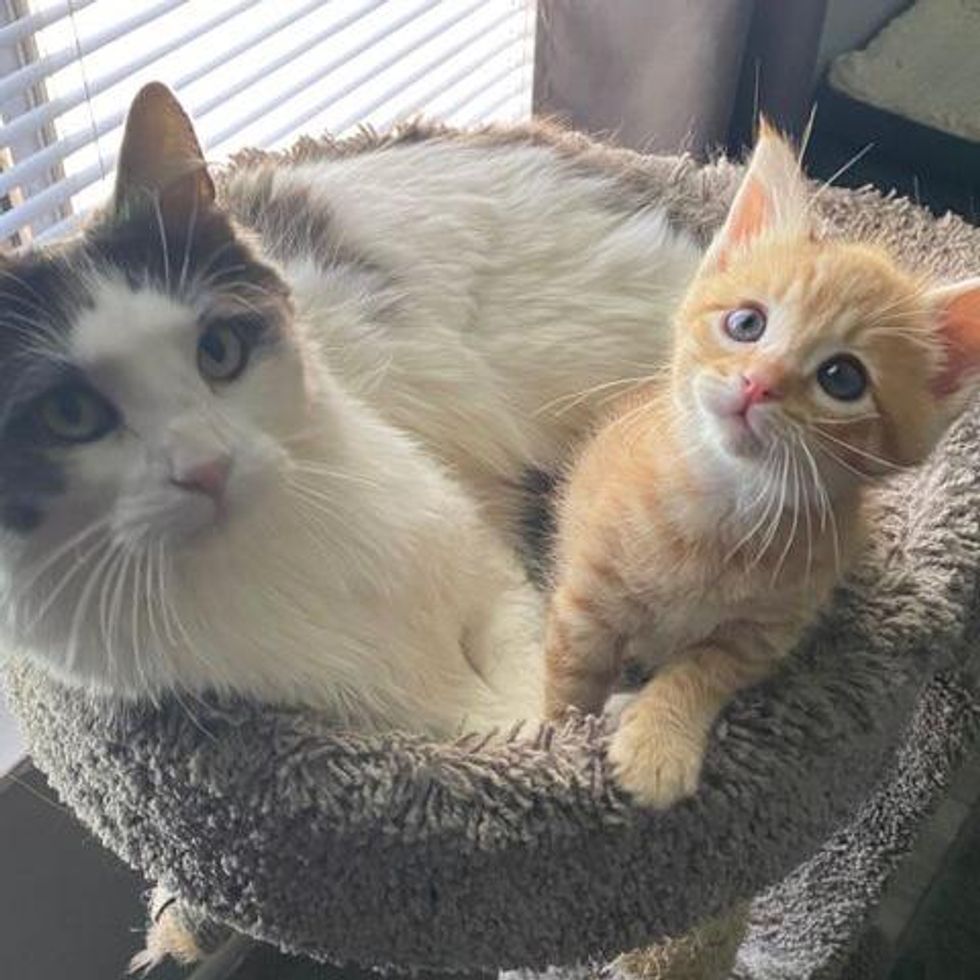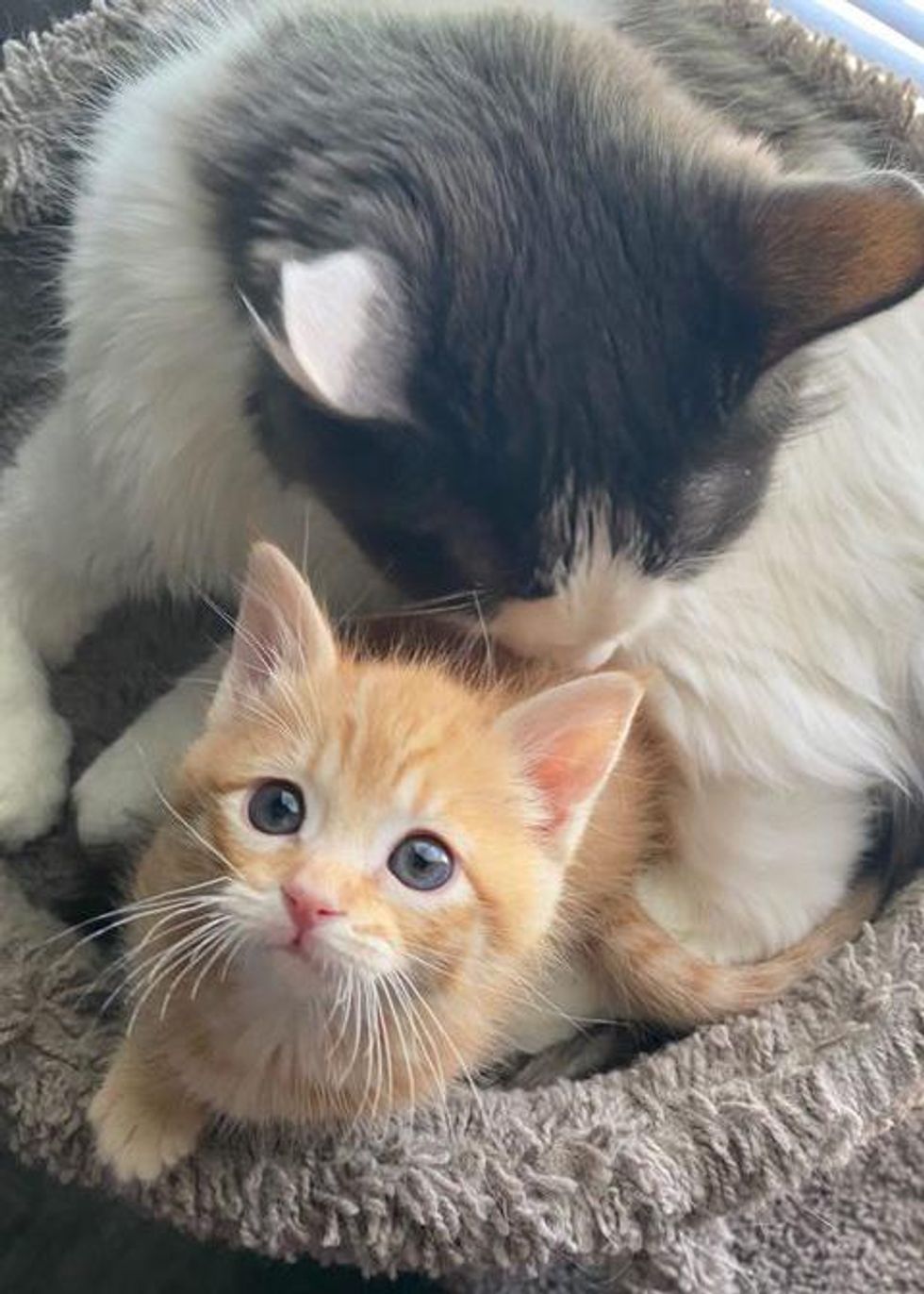At about six weeks old, Winnie has flourished into a happy, chonky tabby with a larger-than-life personality. She is learning to play nicely from her feline mentor, and growing to be such a heart-stealer.
