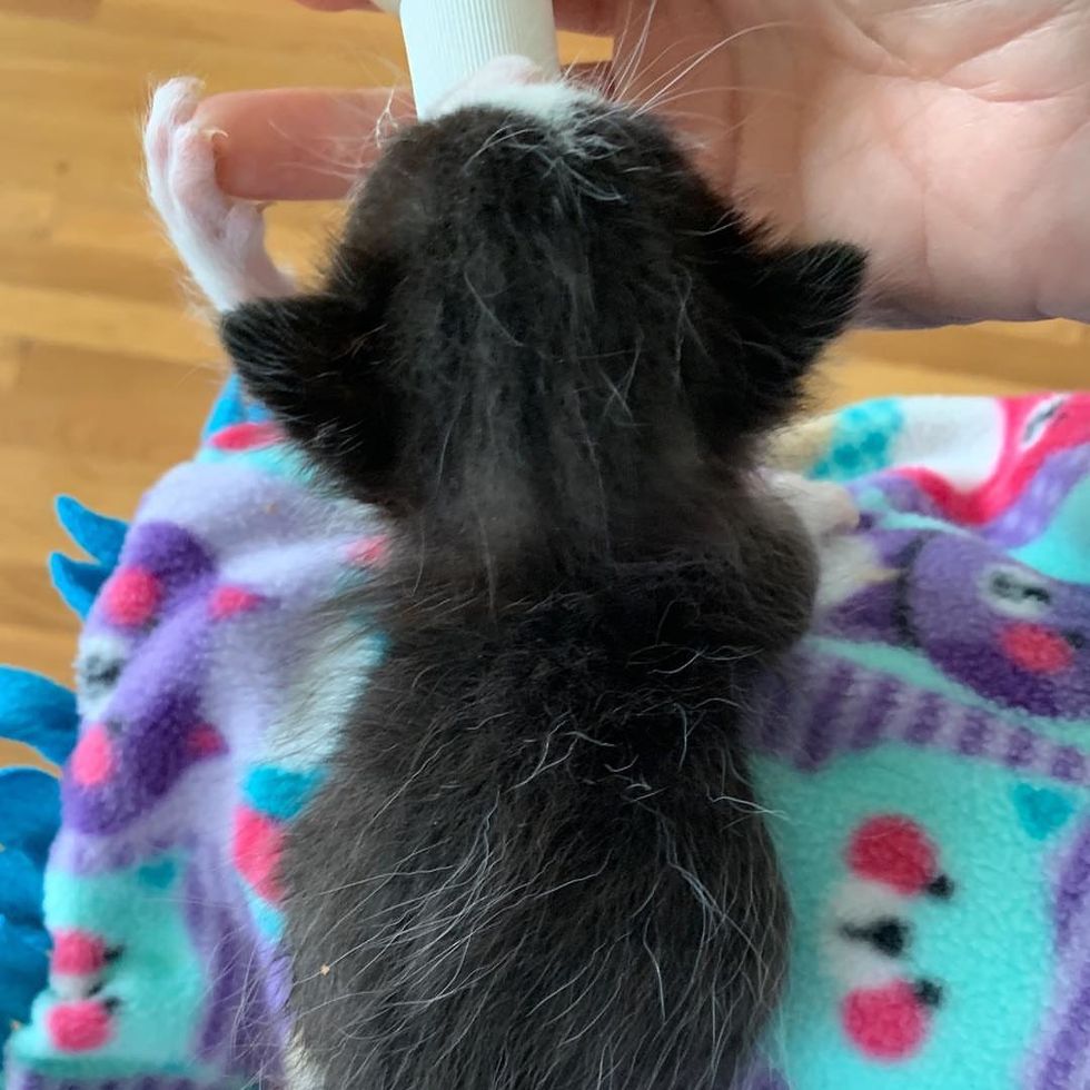 After a warm bath to remove the pesky fleas, he was given kitten formula and supplemented with fluids to help stay hydrated. "He wasn't sure about the formula, and it took him a little while to get the hang of it."