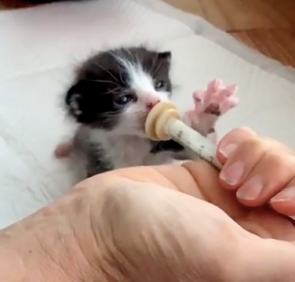 The kitten was in poor shape but tried with all his might to eat. Once he figured out how to drink from a syringe, he scarfed down every meal like a champ.