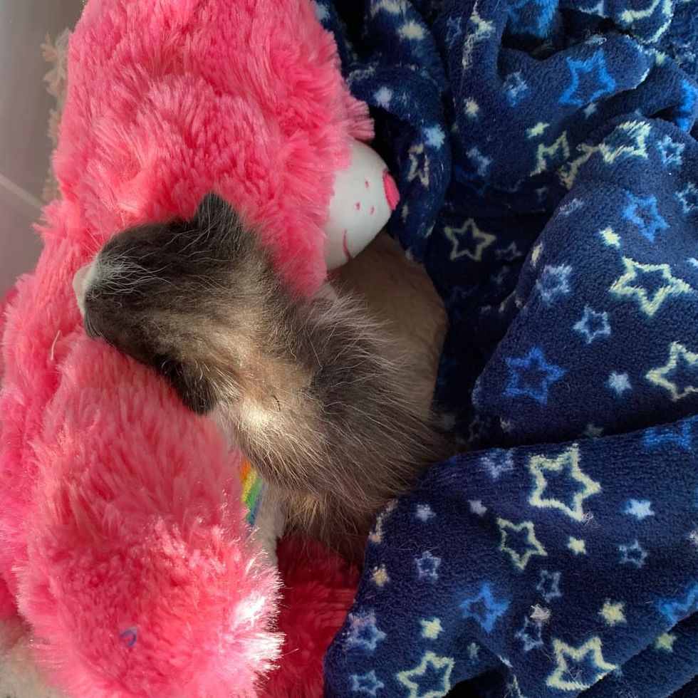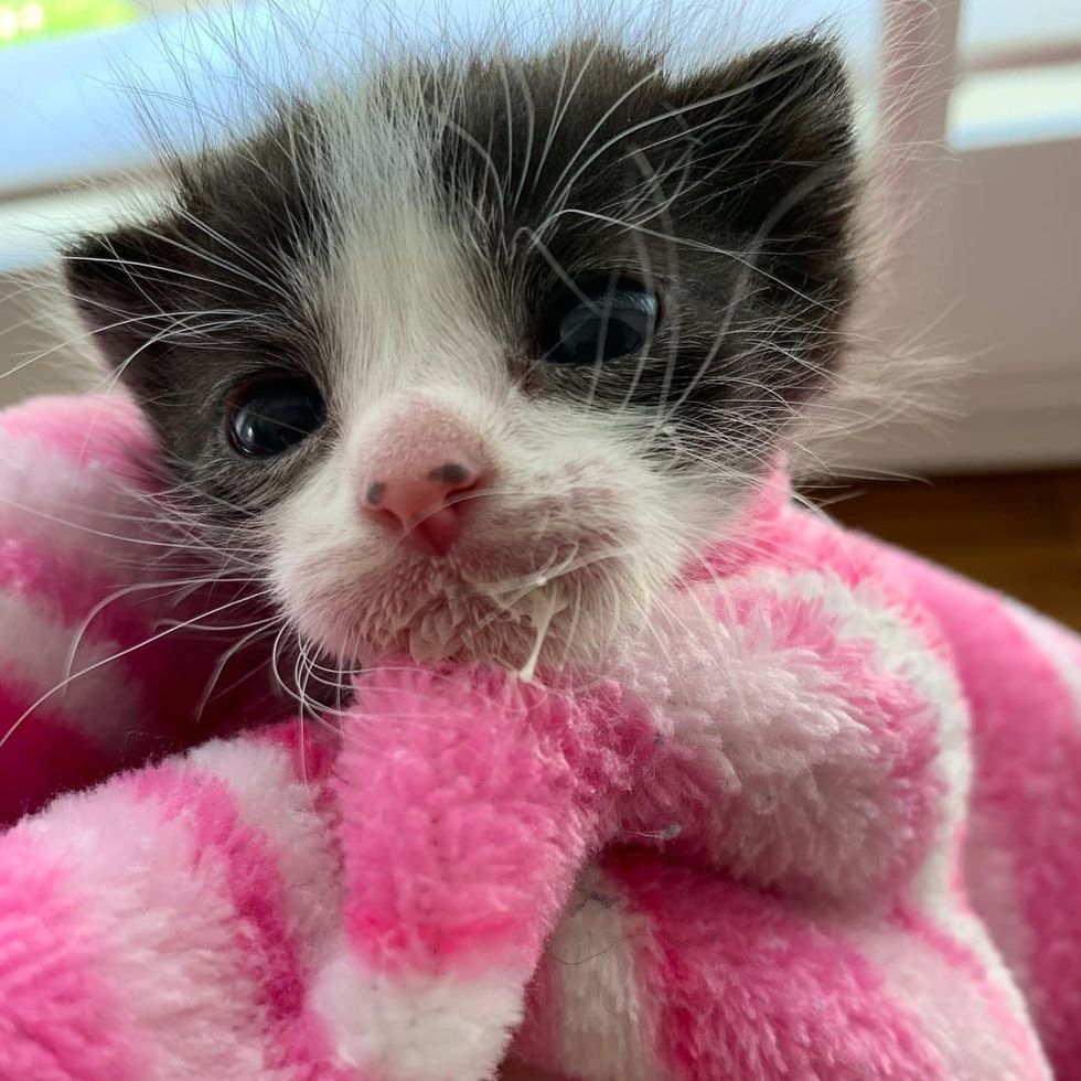 The kitten was just the size of a newborn and had already used several of his nine lives. He was tiny, malnourished and covered in fleas. Desiree immediately offered to care for him as he needed round-the-clock care to survive.