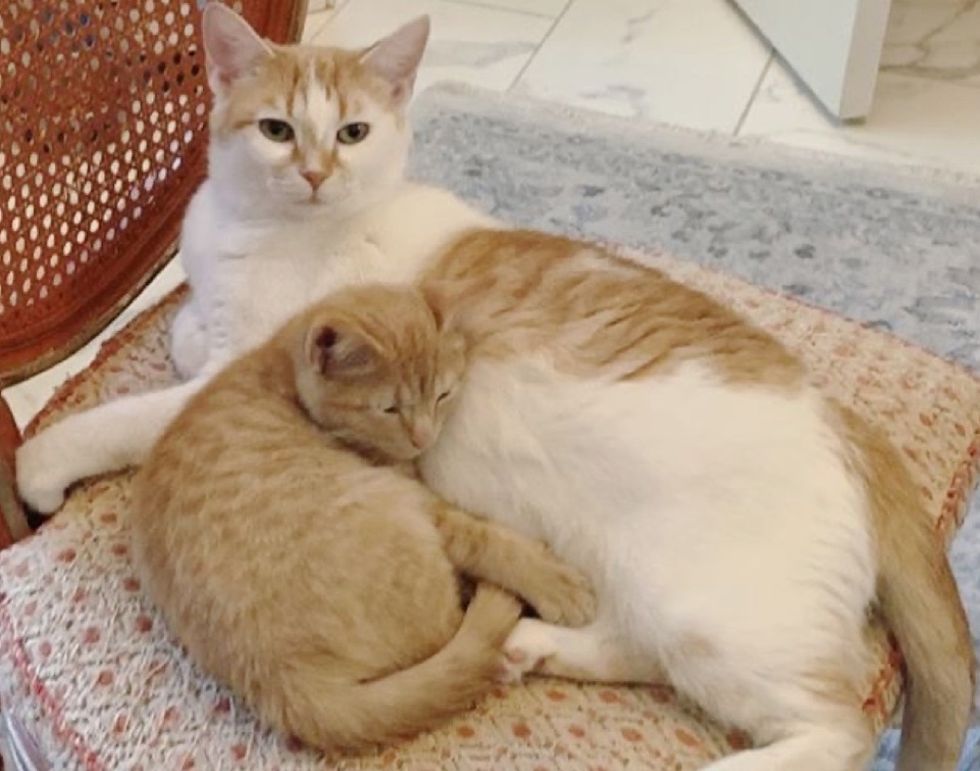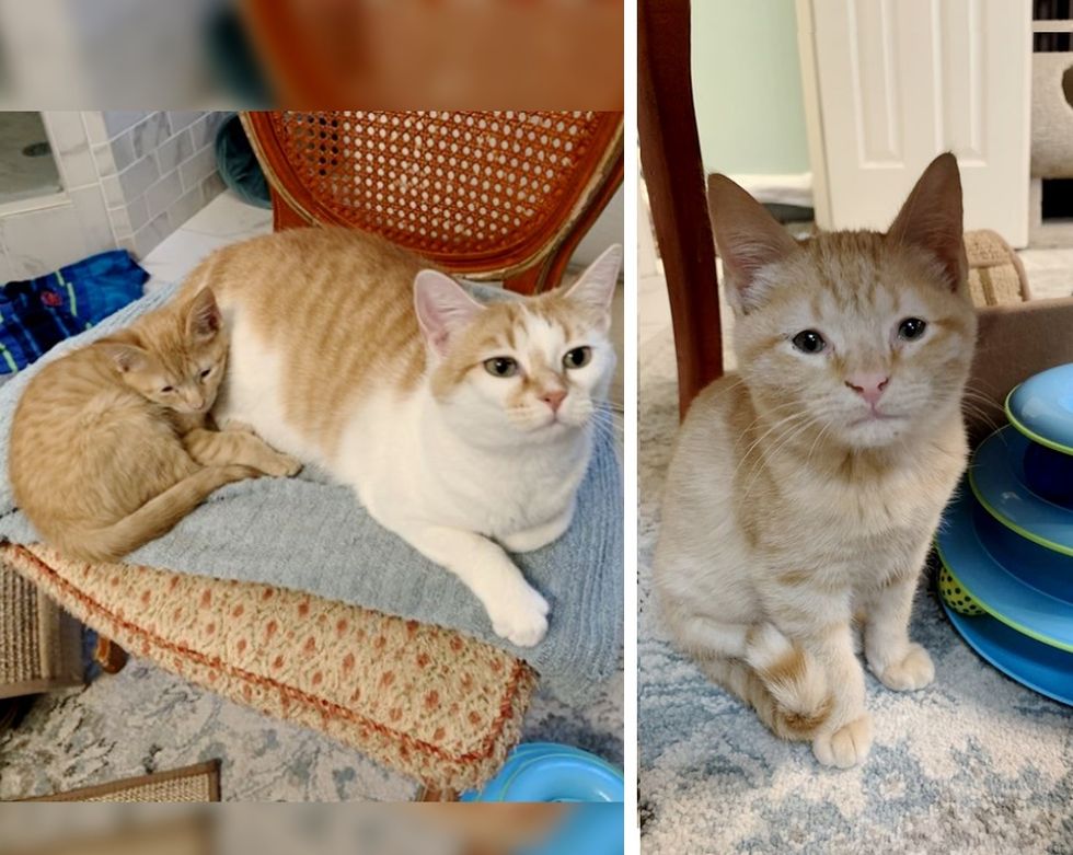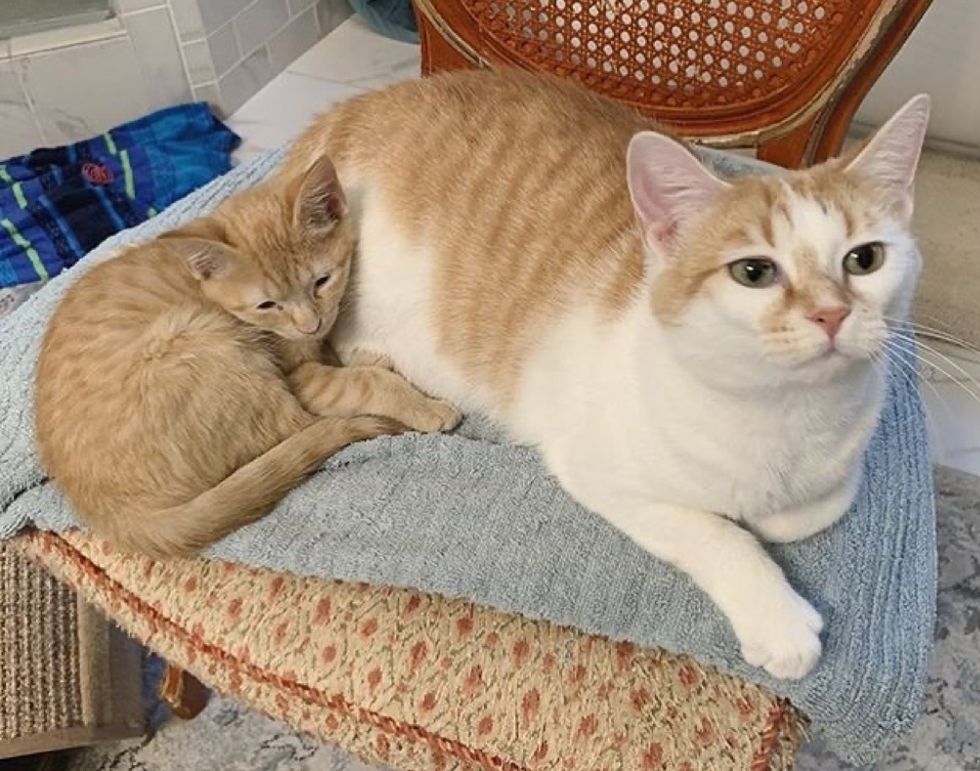 The 3-month-old ginger cat quickly grew attached to his new mom. He wanted to cuddle and cling to her for as long as she'd allow him. The feeling was mutual for Mia, who happily kept her new baby company and showered him with licks and unconditional love.