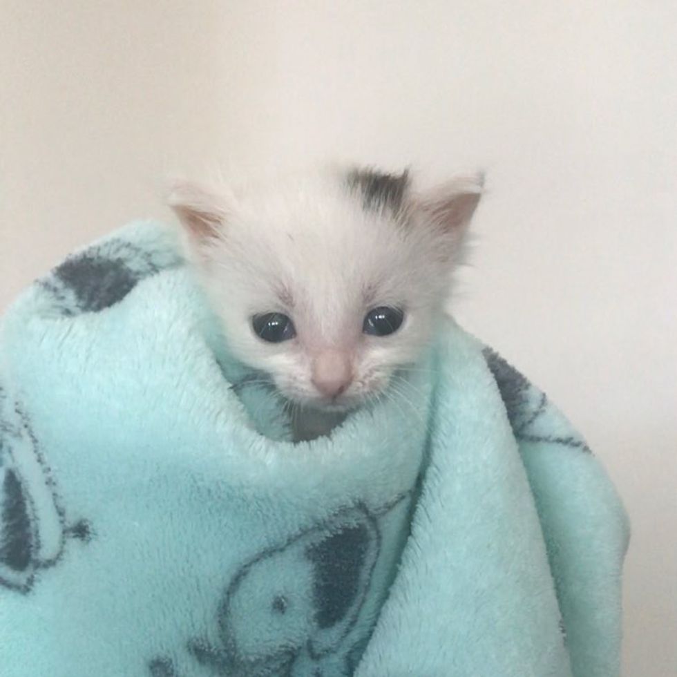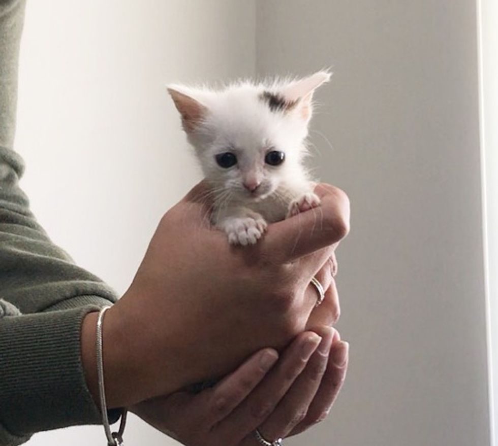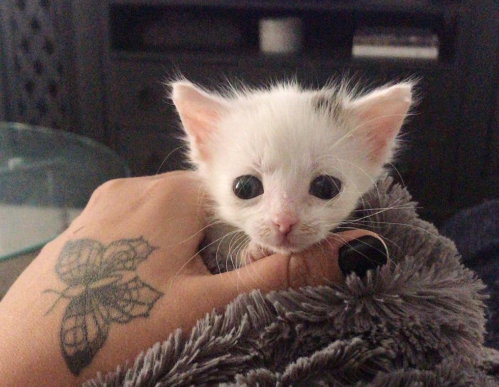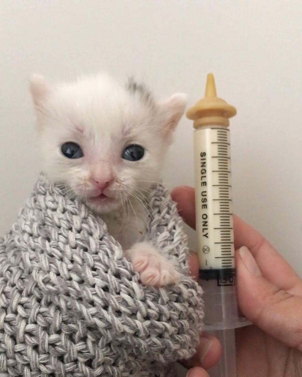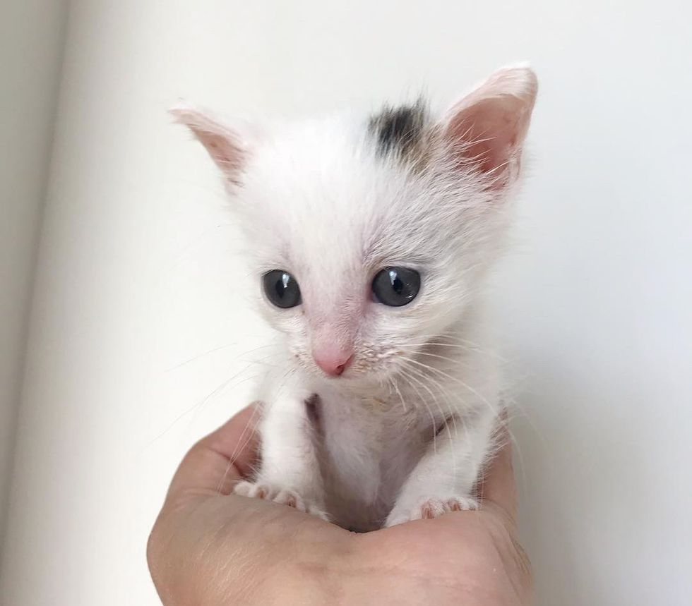 She took him home to foster, knowing he had a long road ahead of him. The kitten, who was just the size of a newborn, was malnourished and anemic, but he used the little strength he had to eat and was determined to live.