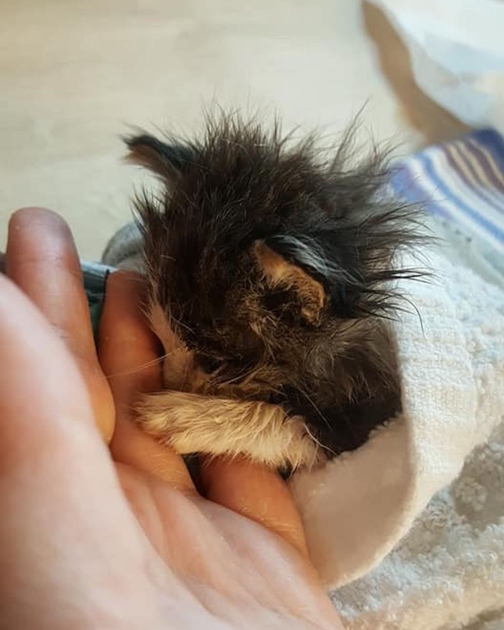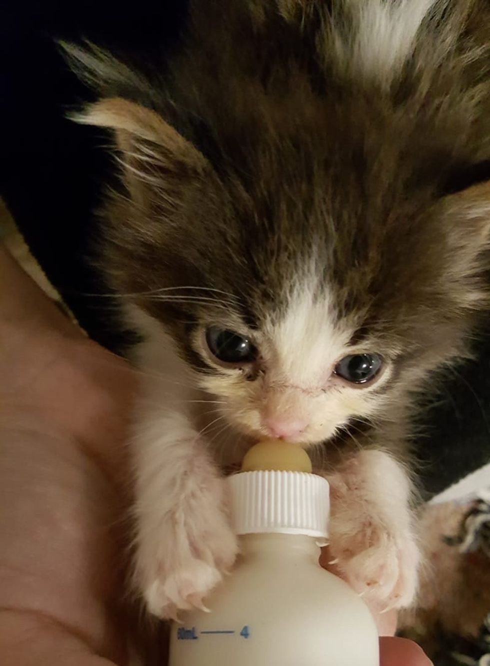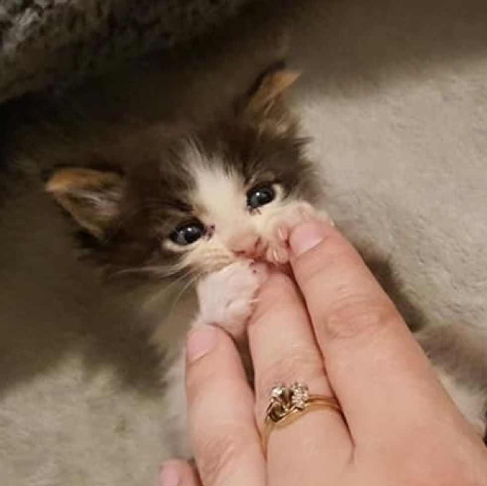 "When she got there early the next morning, two kittens had passed," Lita Katulski of Feline Hope told Love Meow. The surviving kitty, Winston, was fighting to live. He was estimated to be around 2-3 weeks old but was only the size of a newborn.