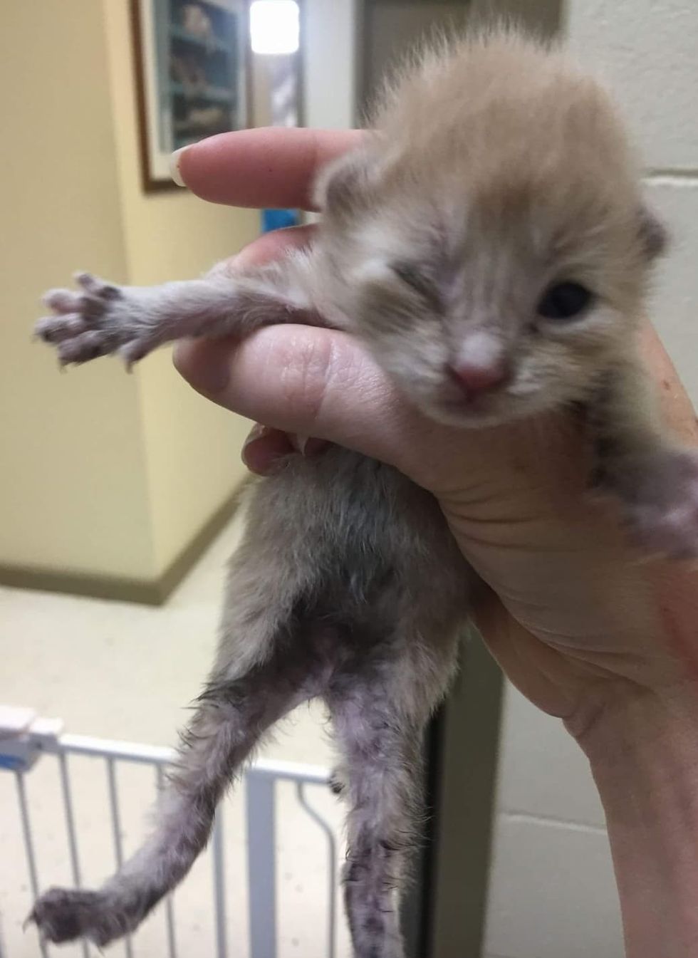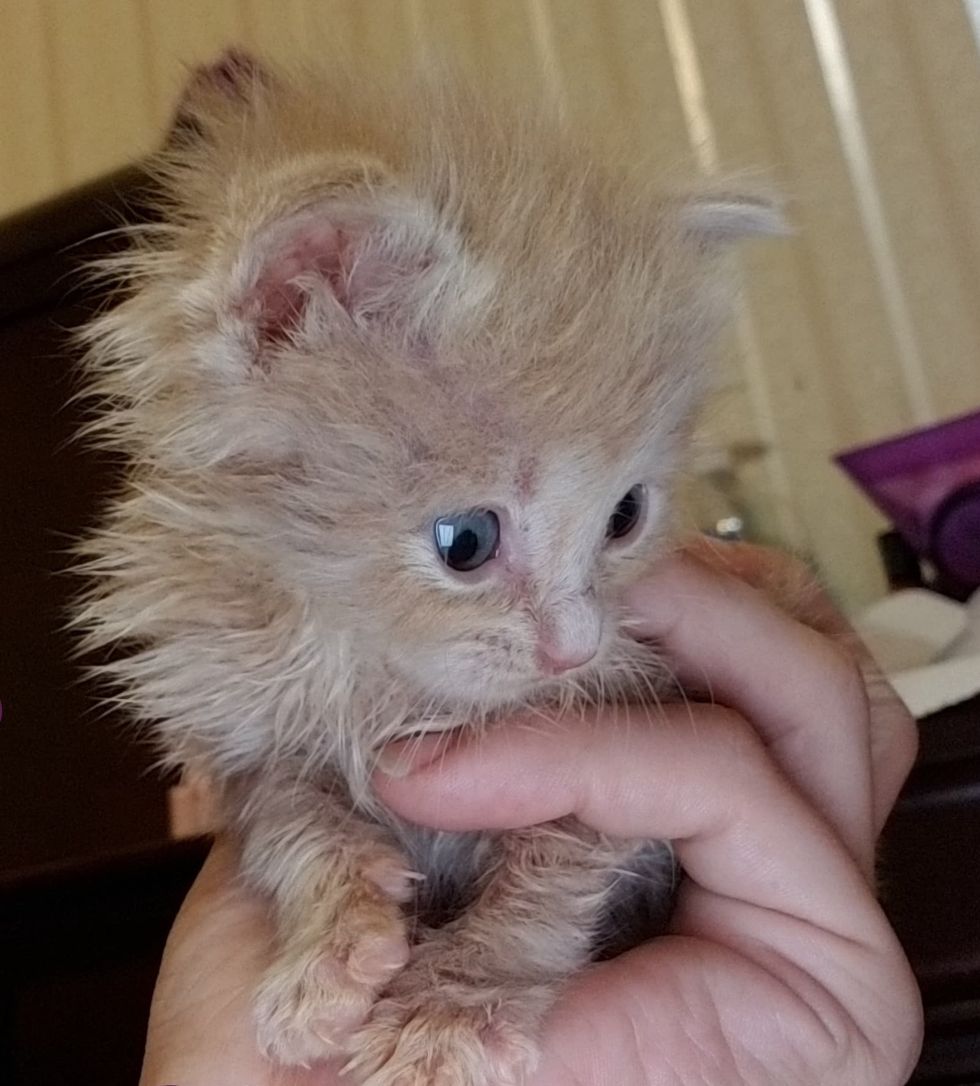 The kitten had one eye that had just started to open, and the other was closed due to an infection. "She was tiny for one week, still the size of a newborn. I gave her the fitting name of Hope."