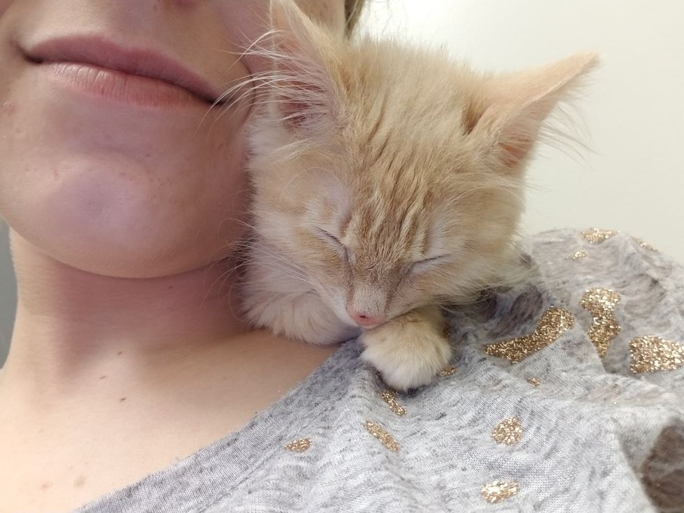 After a long day of snuggling, the sweet kitten falls asleep on her favorite nap spot.