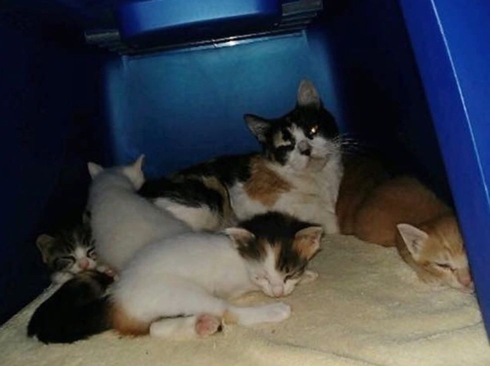 The mama is very shy but glad to be back with her kittens and have a comfortable place to raise her babies.