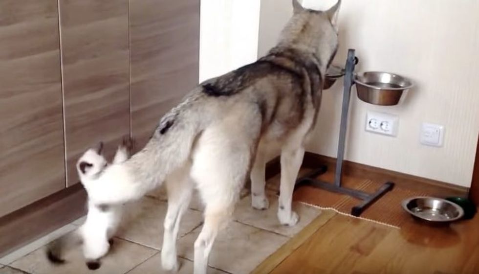 This little kitty is not letting his big Husky eat in peace. He hops and grabs the doggie's leg and then proceeds to fight it with a few bunny kicks.