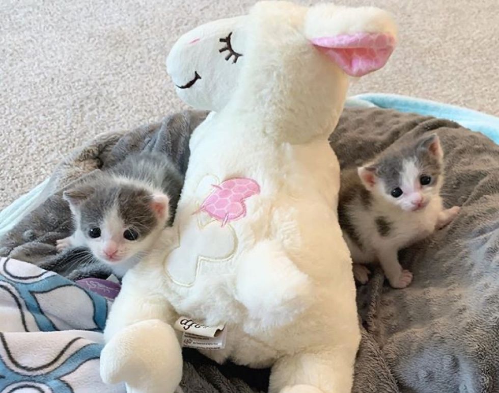 While keeping an eye on the kittens, Lauren got some help from a plush toy, aptly named Snuggle Lamb, and placed it between the twins so they could nurse on her instead.