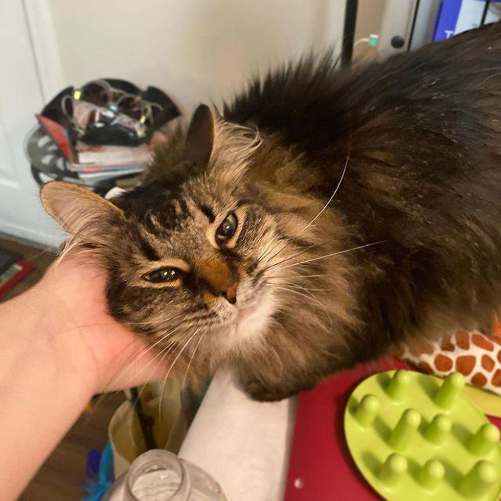 The former stray has blossomed into a fluffy, chonky, handsome fella.