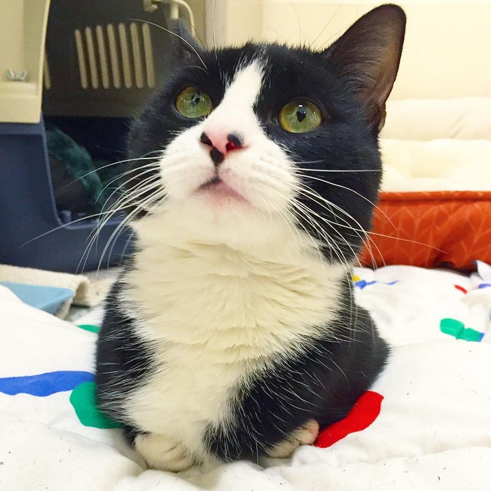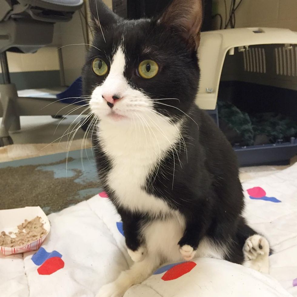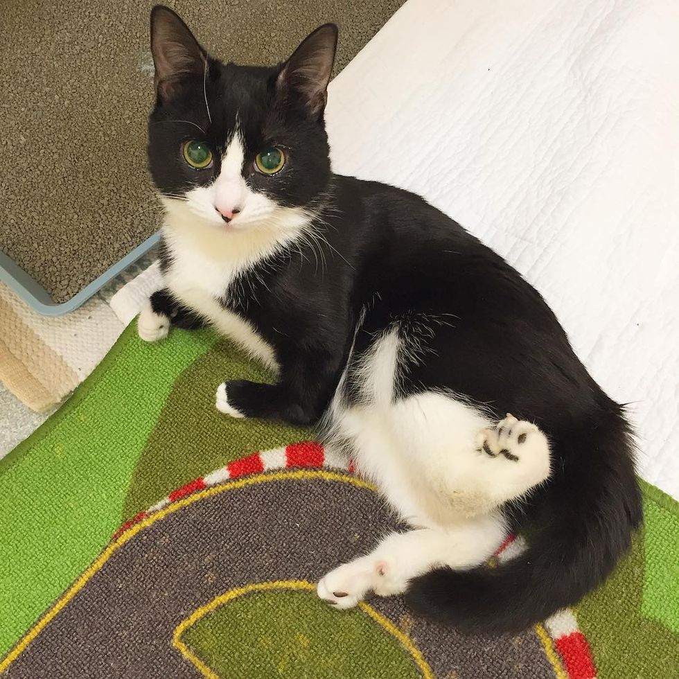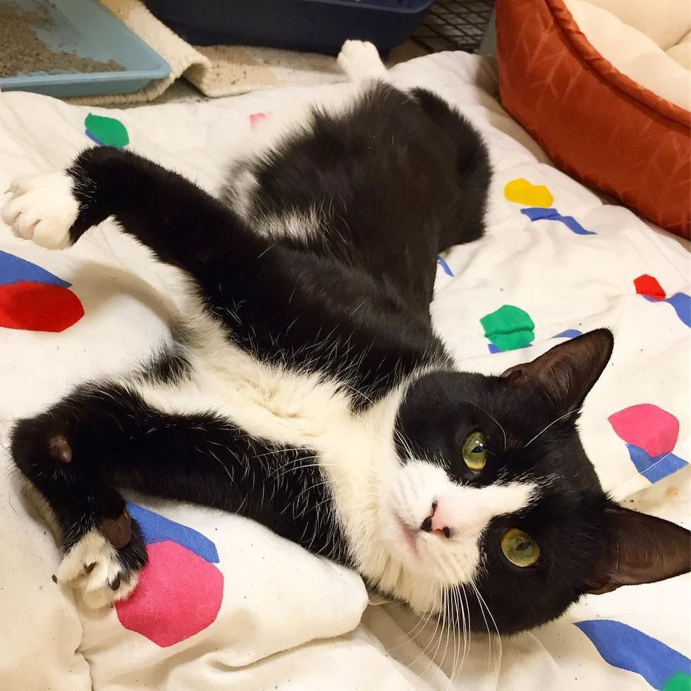 The ten-month old tuxedo has malformed legs which makes it impossible for him to walk properly. He was surrendered to the shelter after his human could no longer care for him due to his deformity.