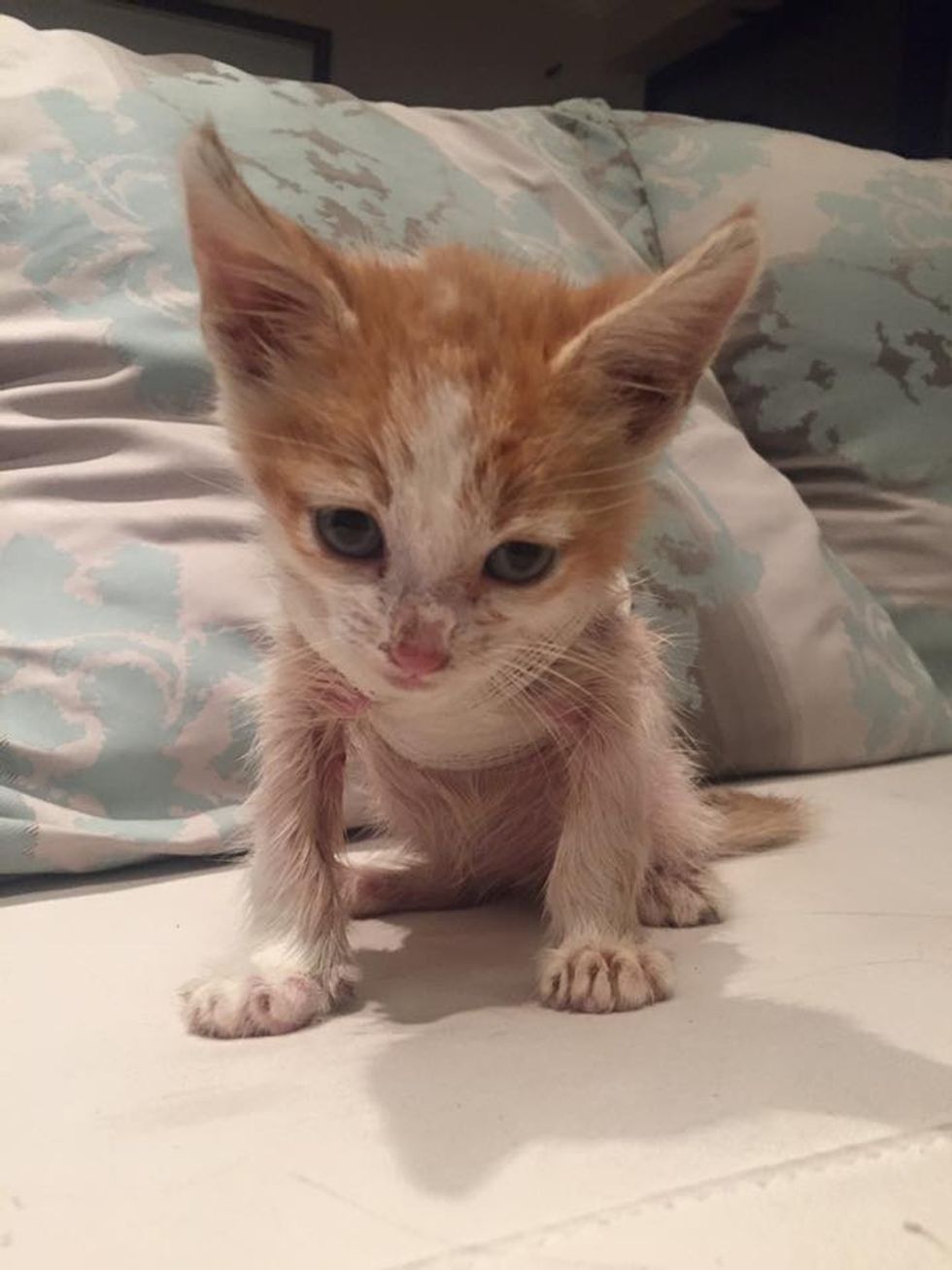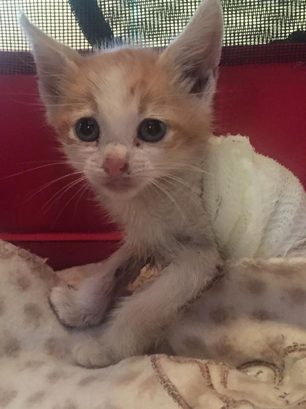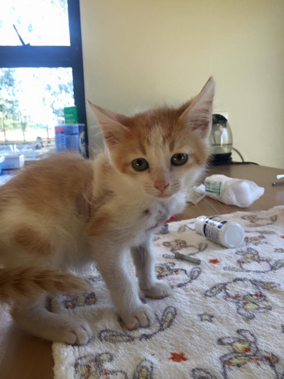 The little ginger and white kitten was caught in one of the forklift trucks. When Warrior came to The Kitten Cottage, a rescue group in Western Cape, South Africa, he was barely hanging on.