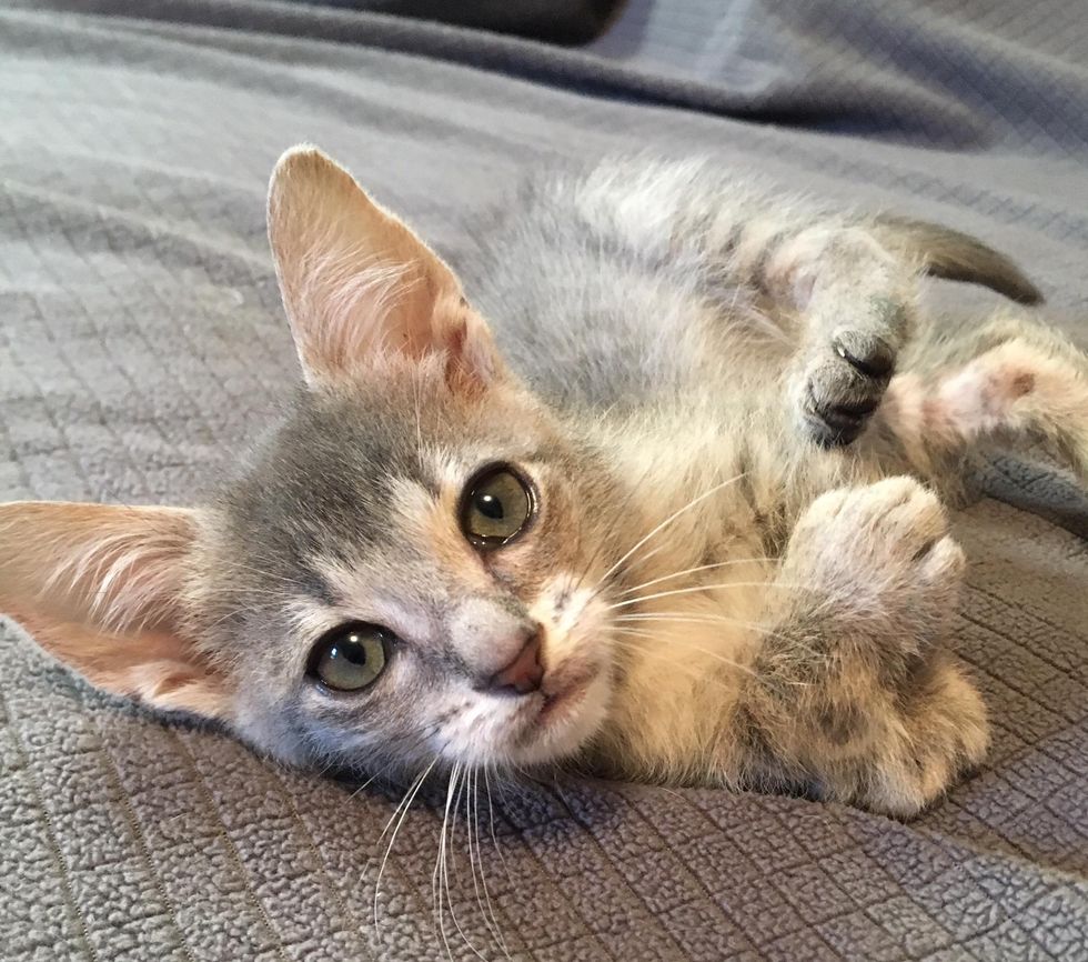 A good Samaritan spotted a very special kitty outside her home all by himself, trying his utmost to survive. His front feet are turned inwards and he walks on the sides of his arms.