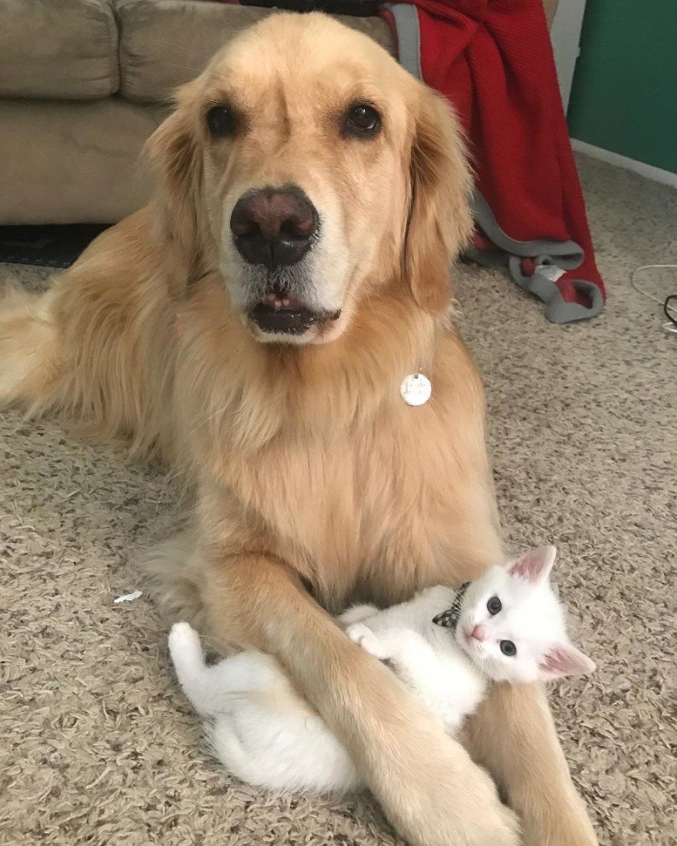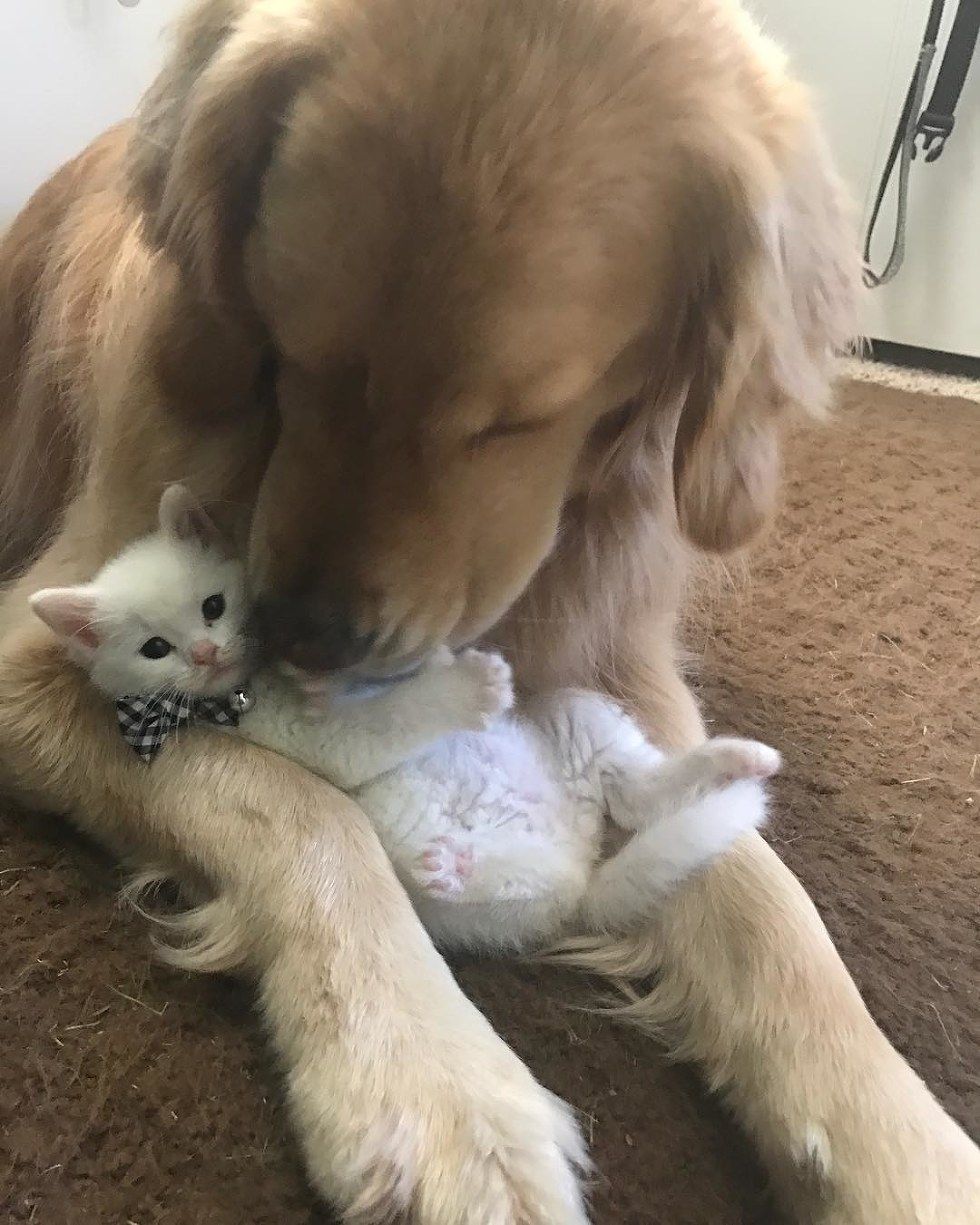 Kim Downie's husband who works at the hospital, brought the tiny feline home. Right away, their Golden Retriever Dog, Mojito, took to the kitten and started giving him love.