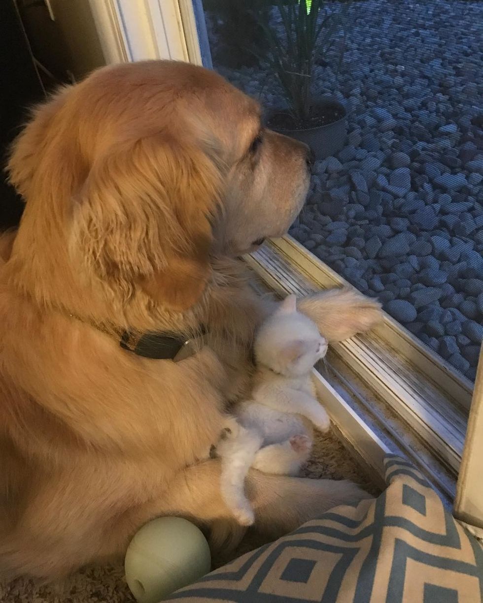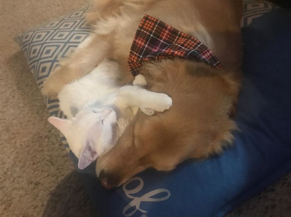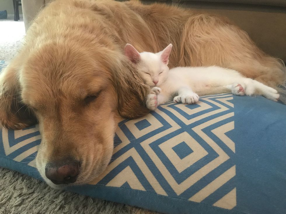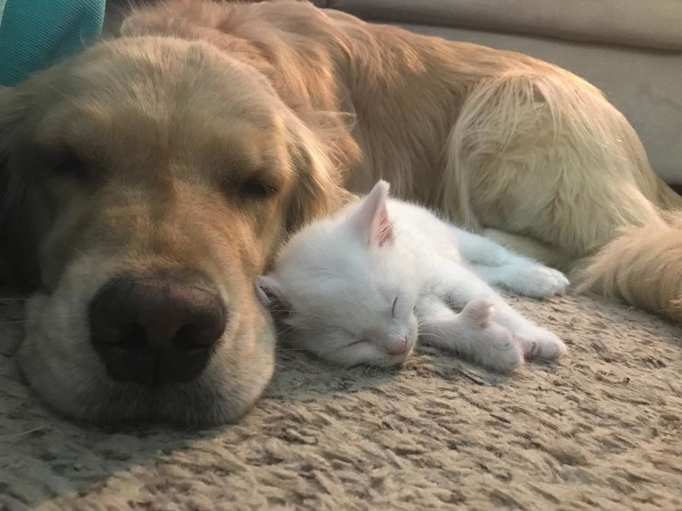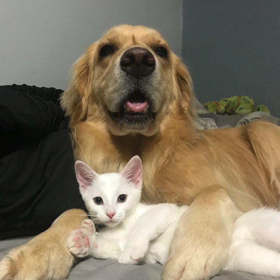 Kim Downie's husband who works at the hospital, brought the tiny feline home. Right away, their Golden Retriever Dog, Mojito, took to the kitten and started giving him love.