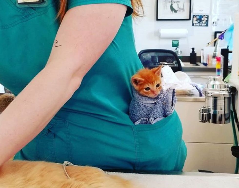 "Quark loves a good swaddle, and Heather (his foster mom) had him riding around in her pocket most of the day as she helped me with our patients," Ellen said.