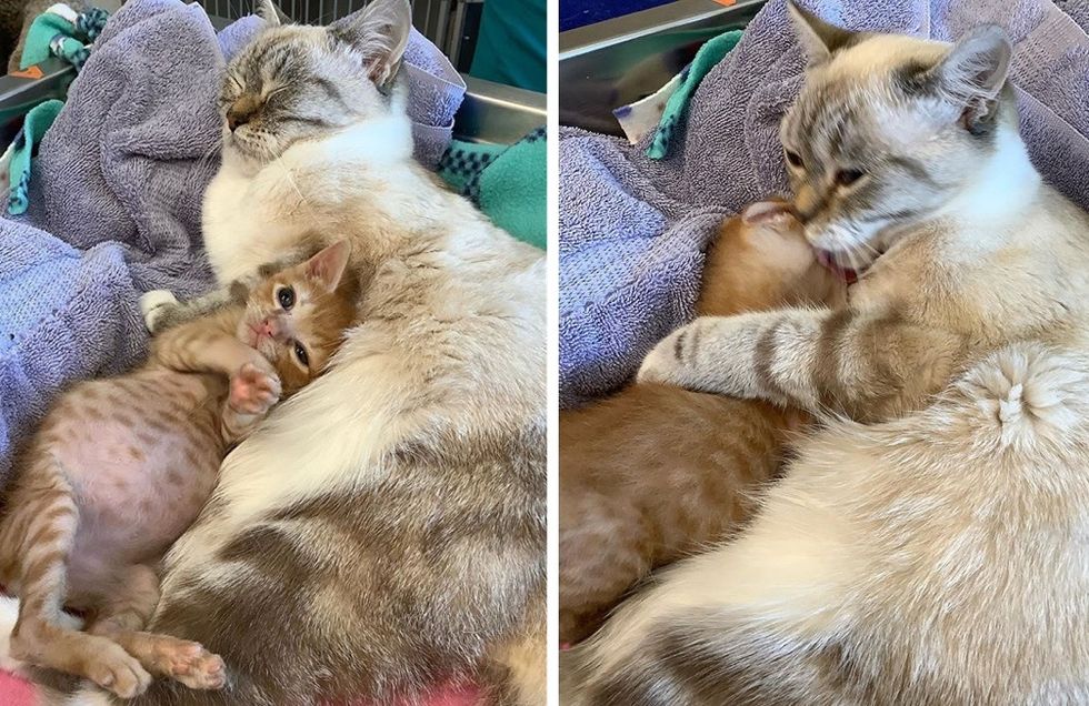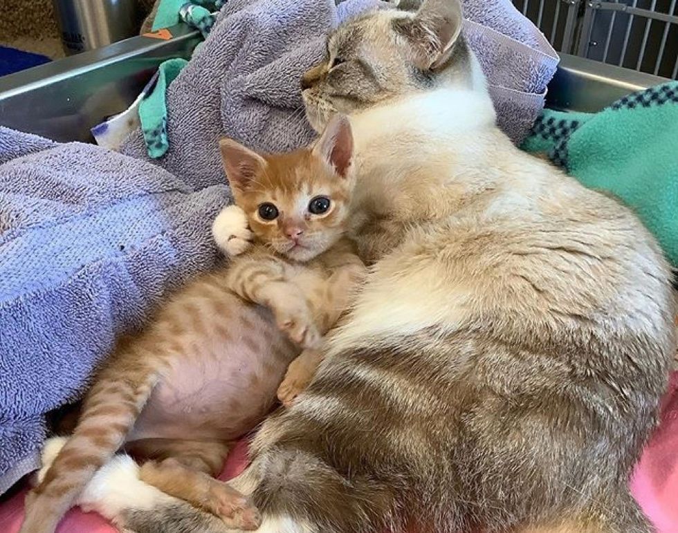 A wobbly kitten came to a veterinary clinic for a chance at a better life. He started giving everyone cuddles, especially his feline friends.