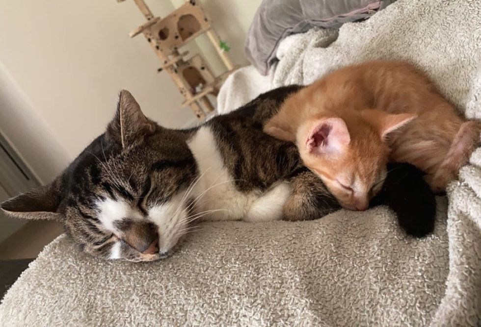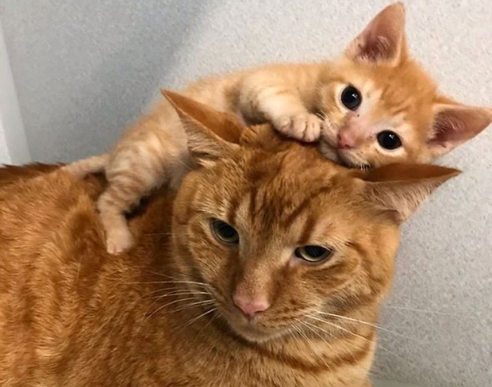 Quark met another ginger named Elvis and immediately decided he needed a big embrace. The kitten managed to wrap his body around his friend and laid his head on his for a full-body bear hug.