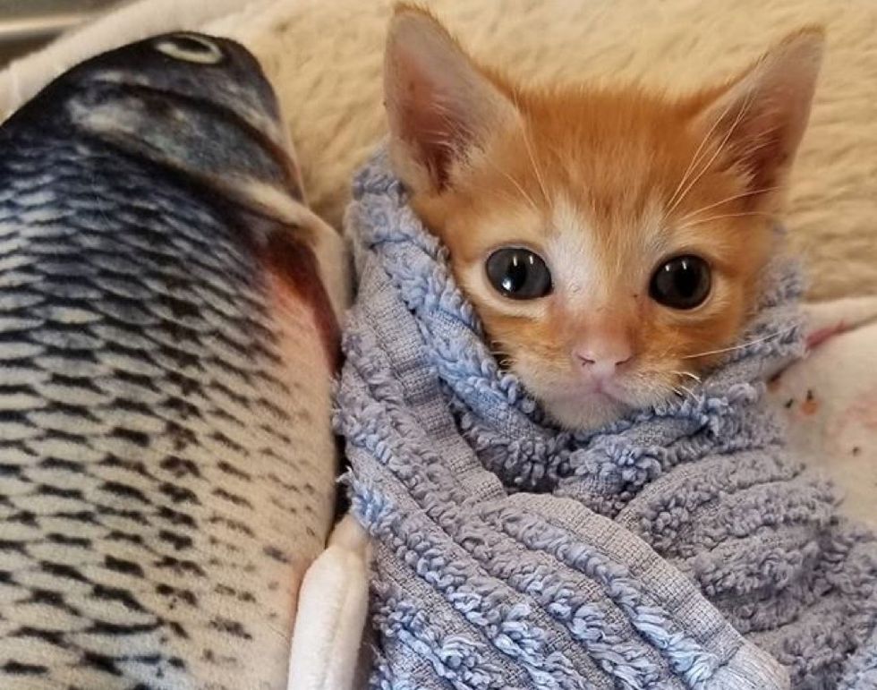 To make sure the kitten never feels alone, they brought a snuggly fish toy to keep him company.