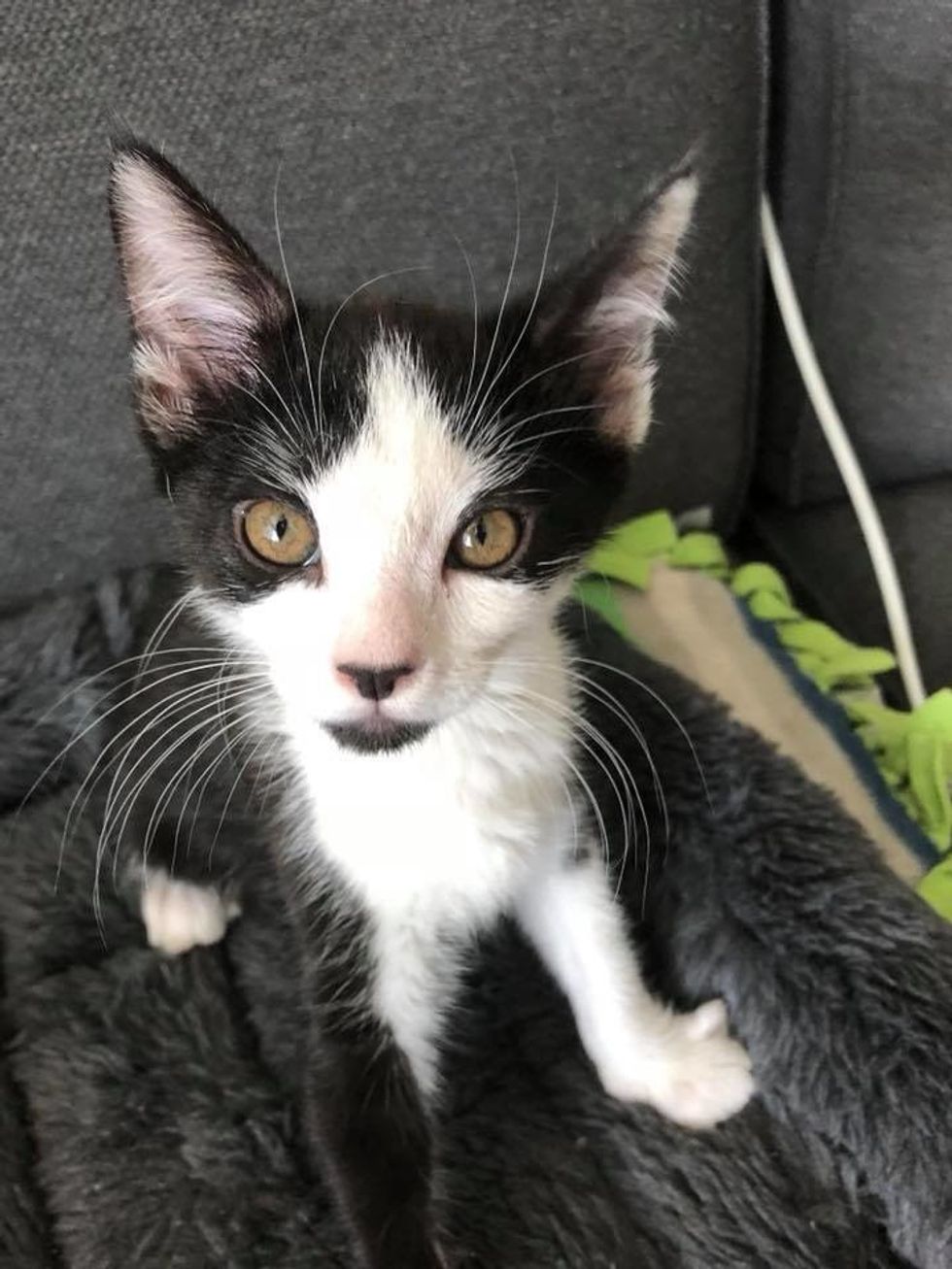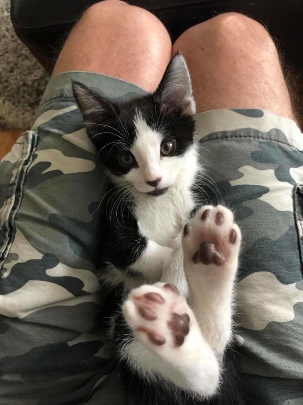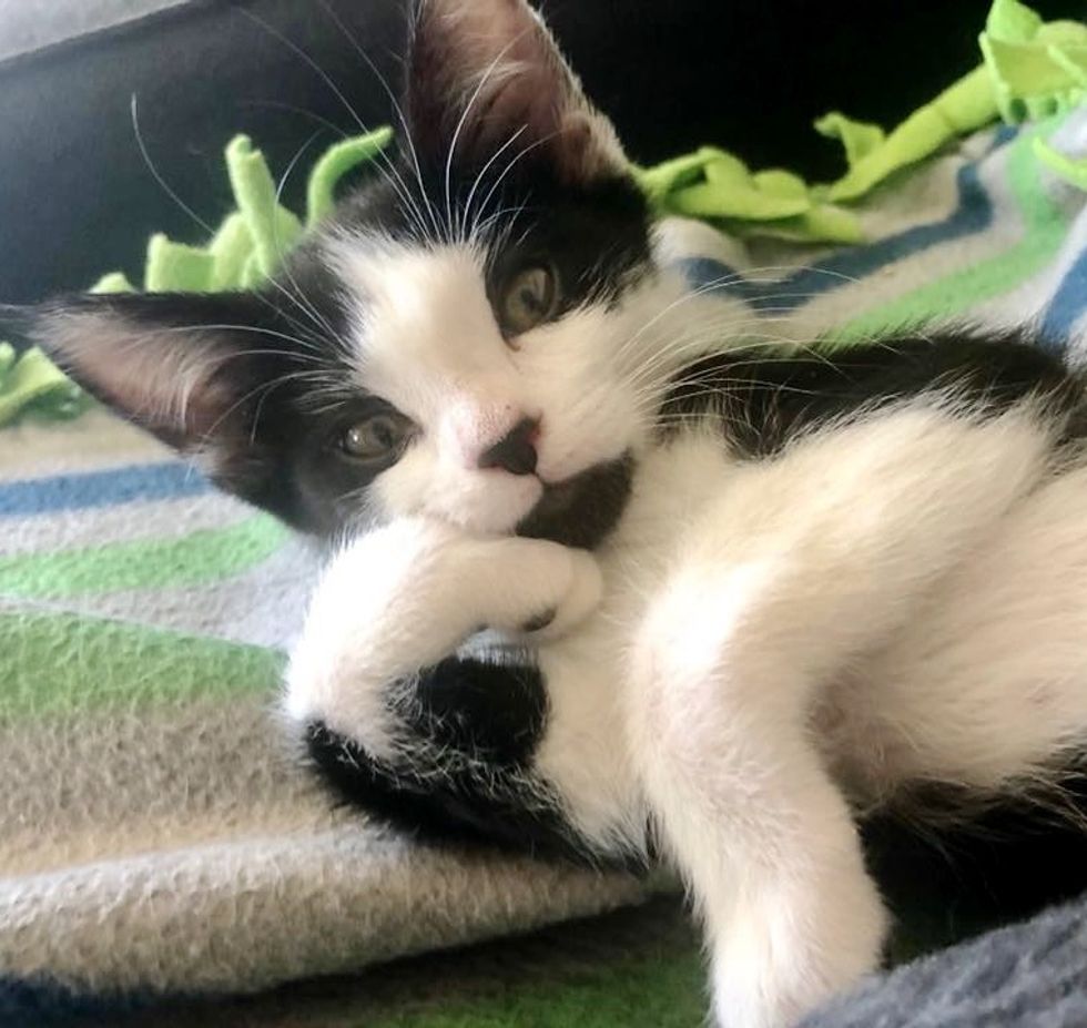 Now this fearless tuxedo can run, jump, climb, play fetch and do anything just like any other kitten.