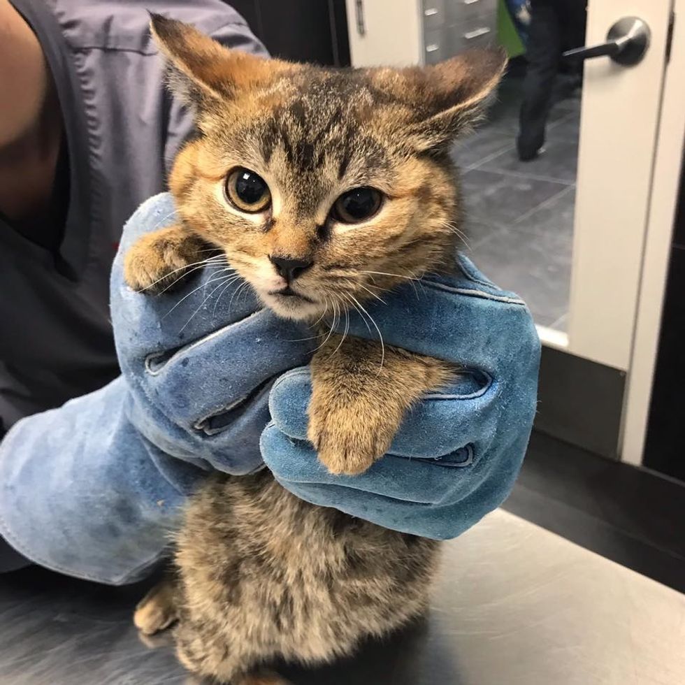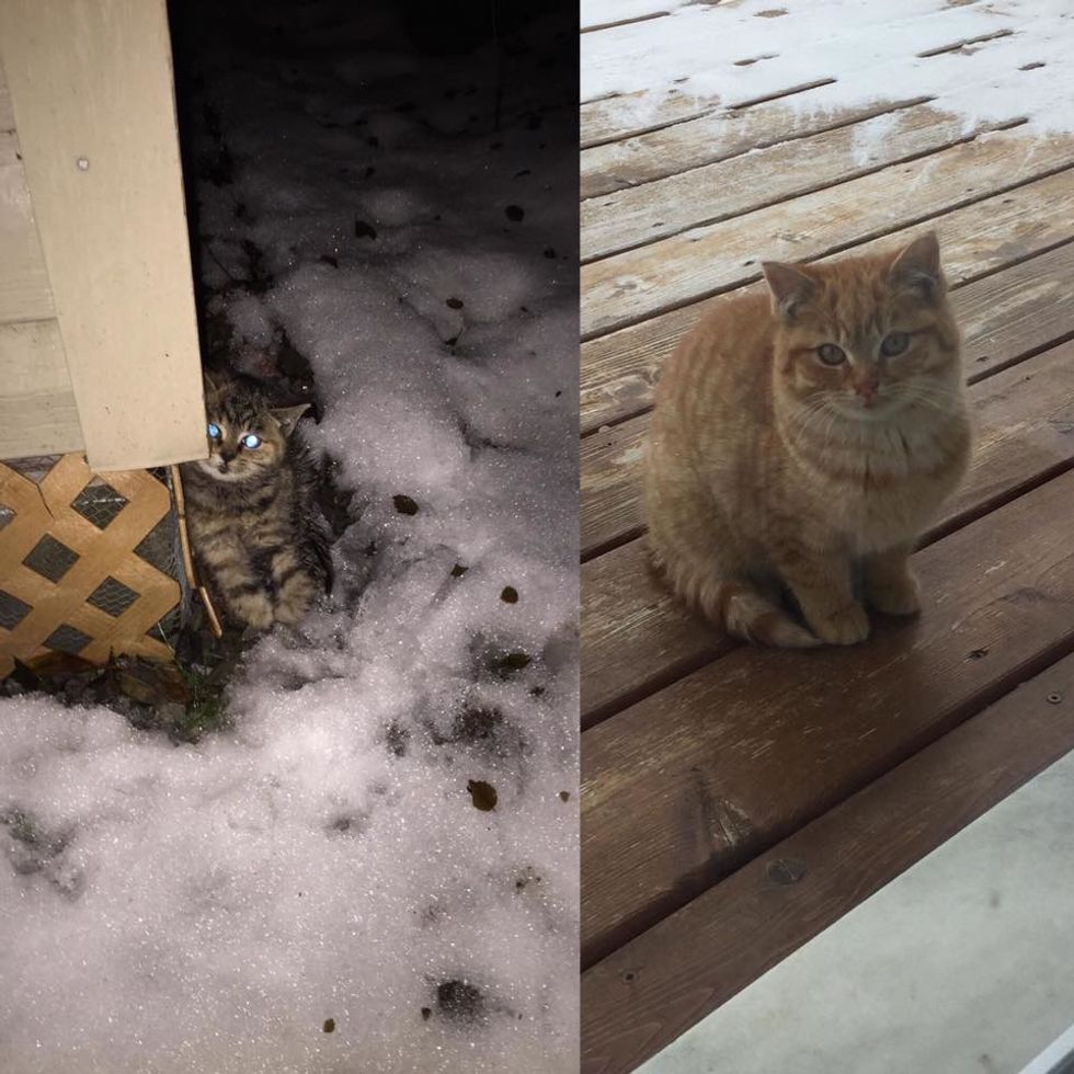 Ani from Montreal, Canada saw the little tabby waddling around outside in the cold. Upon investigation, she was surprised to find another kitten with her.