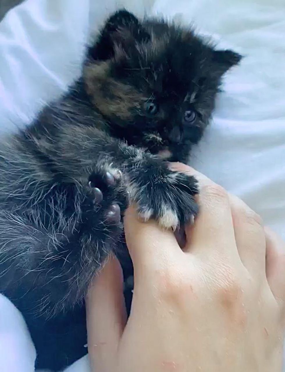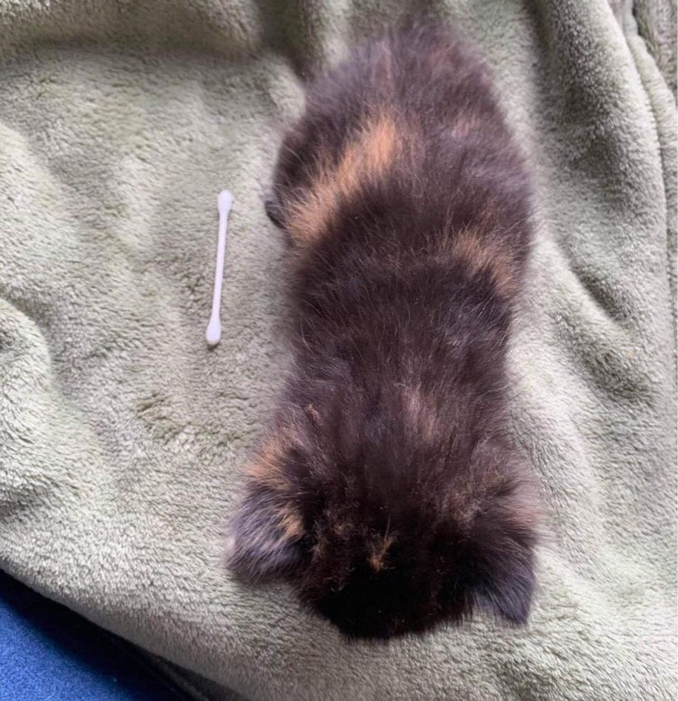 They continued to search for other kittens and a mother cat, but couldn't find anymore. The couple wrapped the tortie in a jacket to keep her warm and secure, and brought her home.