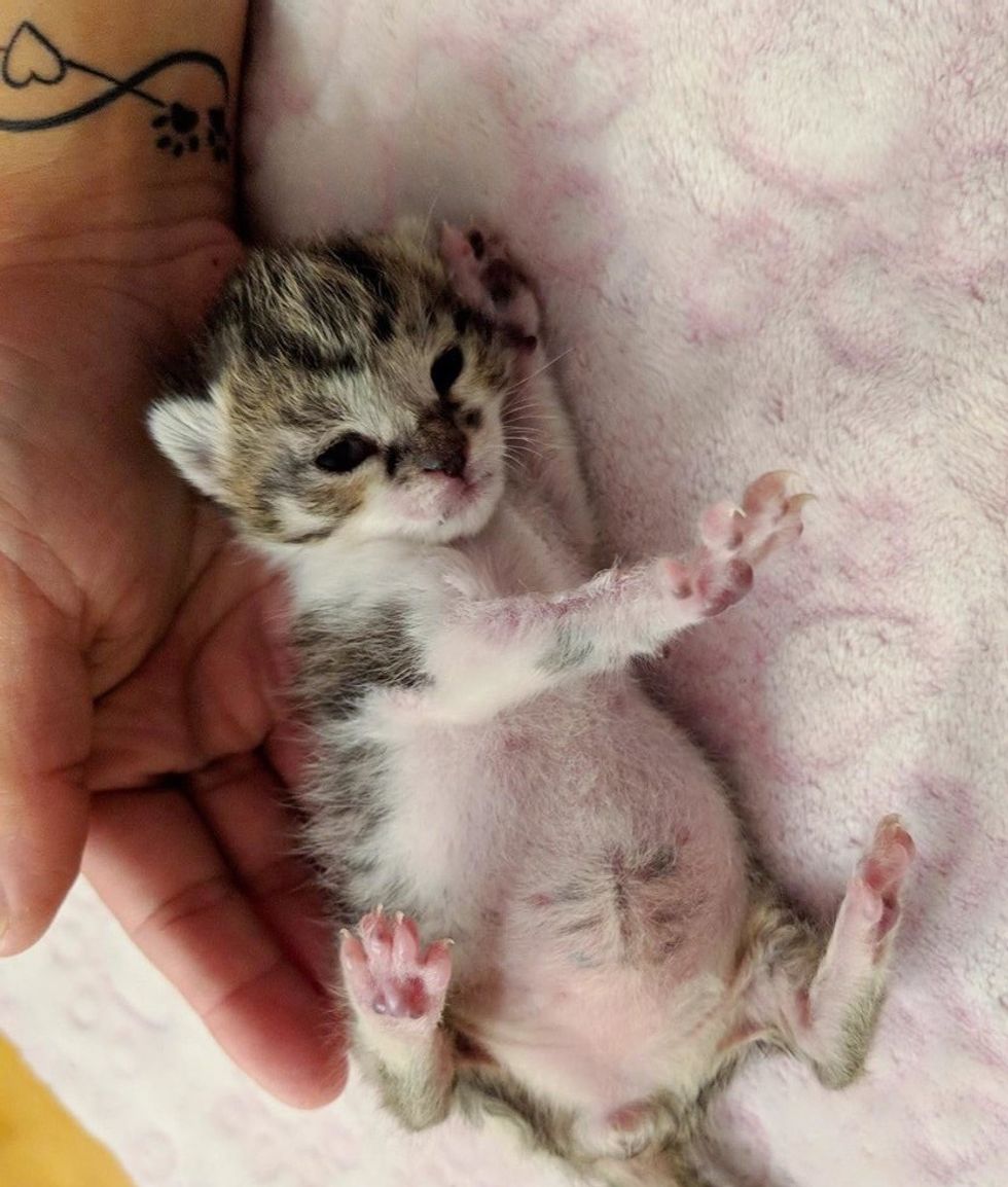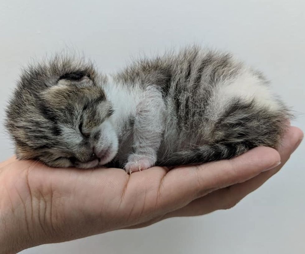 Jessica took the palm-sized kitten into her care and immediately started emergency feedings, one drop at a time, while slowly warming him up. At just 86 grams, the kitten was dehydrated and underweight.