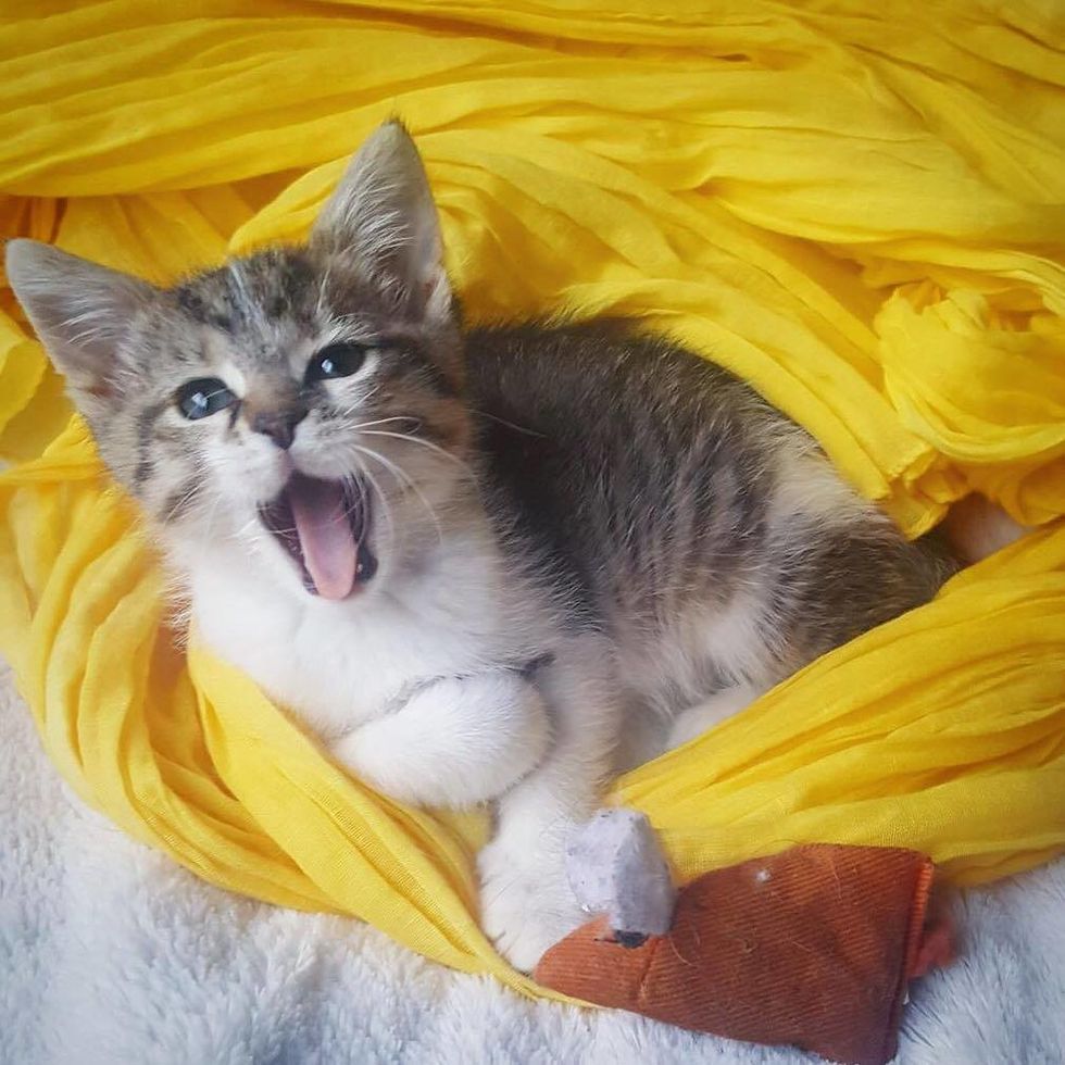 The kitten was just one day old when he was found abandoned at a farm near the woods in Montreal, Canada. He couldn't see or hear and was cold to the touch. Despite being very frail, he used everything he had got to scream for help, which eventually led to his rescue.