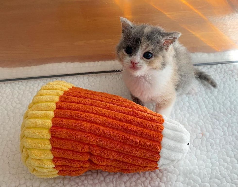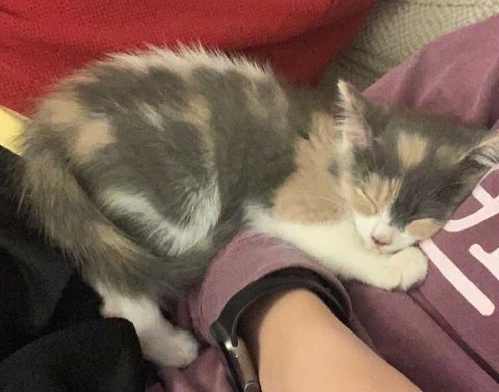 A sweet calico kitten kneaded her way into the hearts of a family after being found by herself in a backyard.