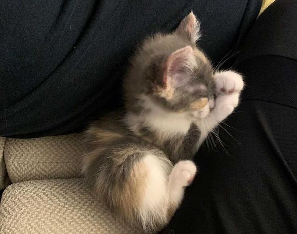 Sarah Kelly, a volunteer of the rescue, rushed to get the kitten as soon as she received the plea for help. The calico was hungry and had an eye infection. Despite it all, she started kneading with her front paws when she was placed on a soft blanket. She went on stretching her toe beans throughout her trip to her foster home.