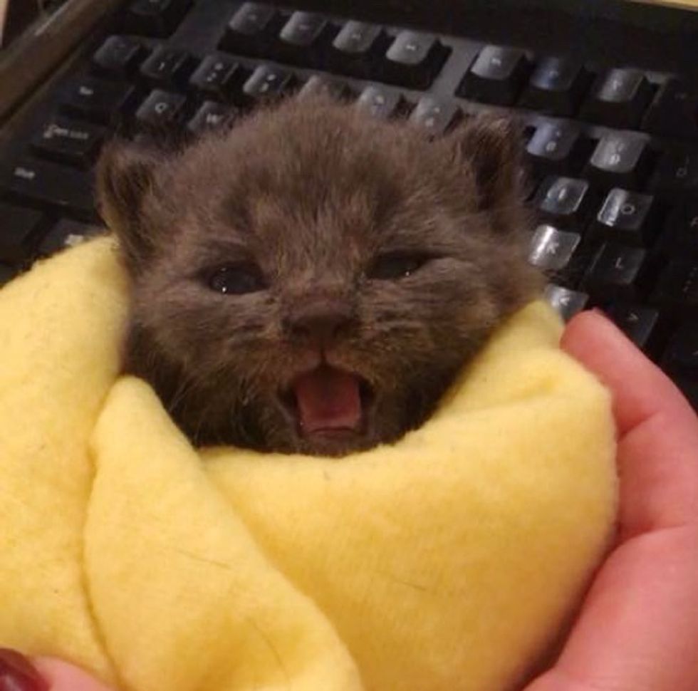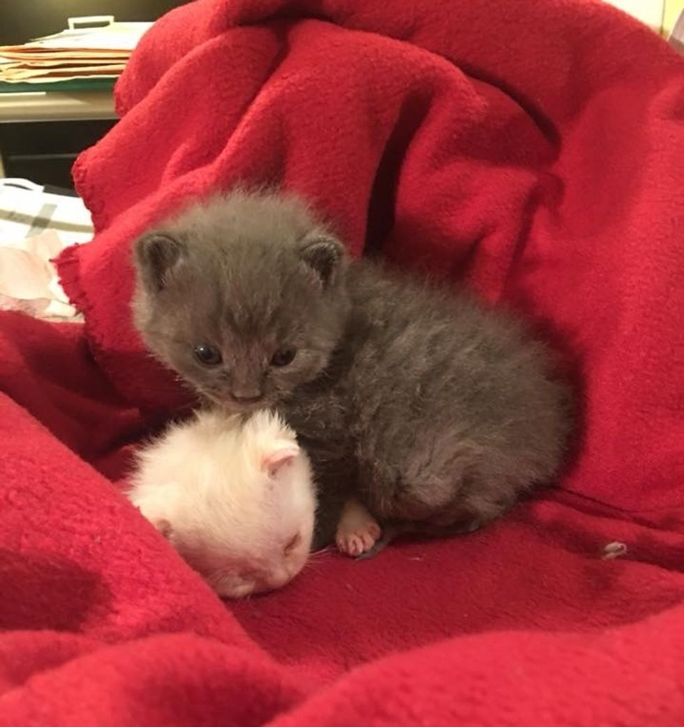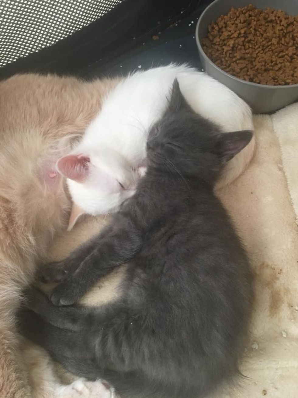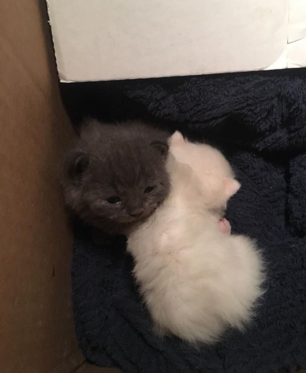To her surprise, the sound came from a tiny grey kitten (Grey Hulk) who was lying on top of his listless brother (Whitey). Karen immediately put them in her shirt to warm them up while trying to wake the weaker kitten with some sugar water.