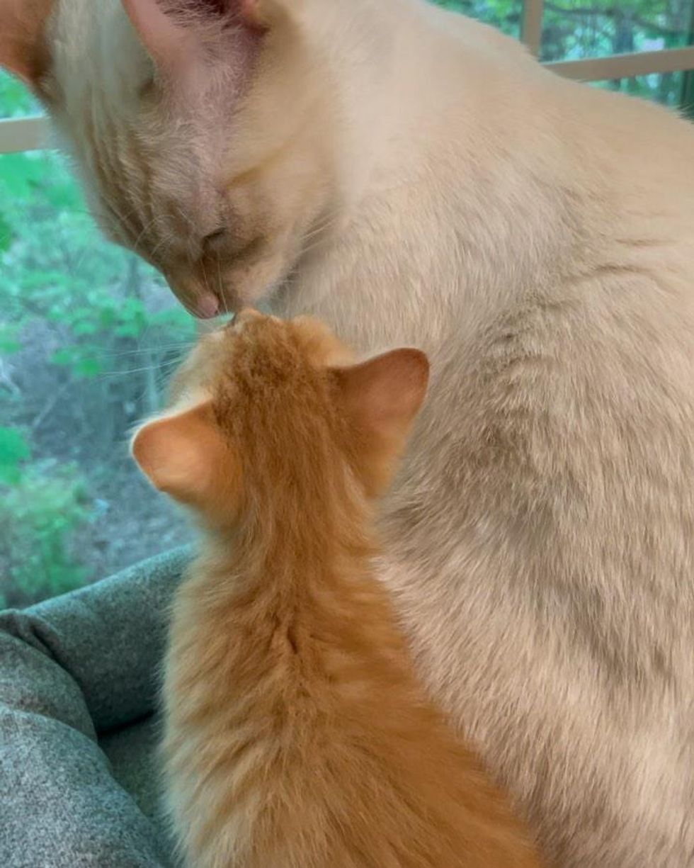 A few days later, Flower had a change of mind and decided that Bear the cat wasn't so bad after all. She went up to him for some snuggles and nose kisses.