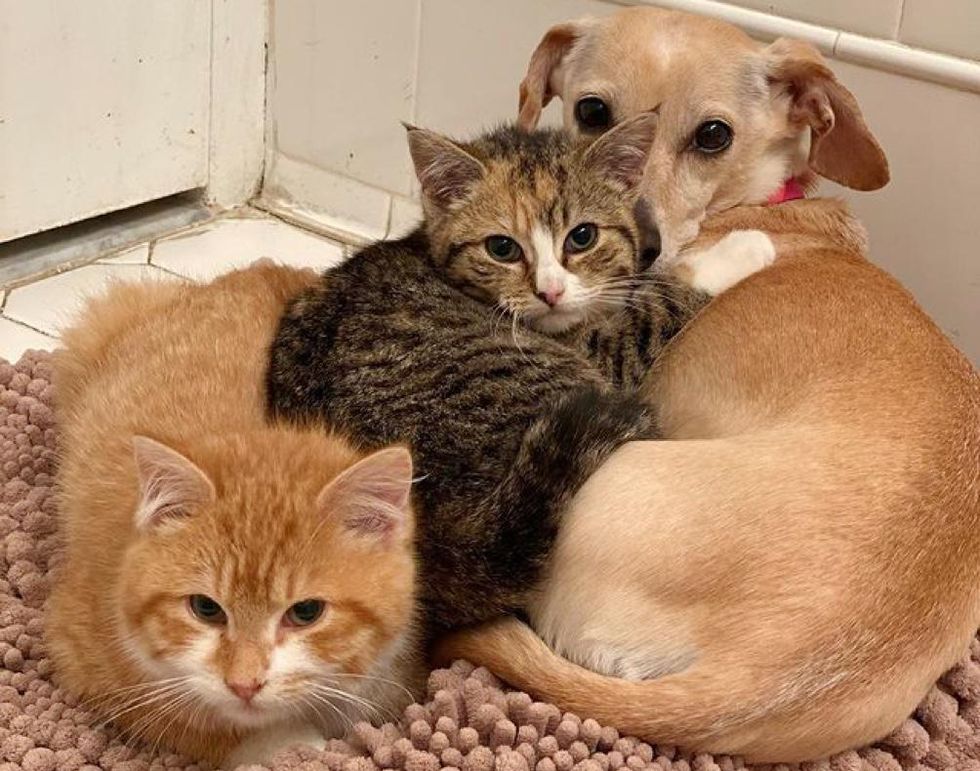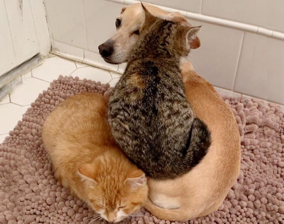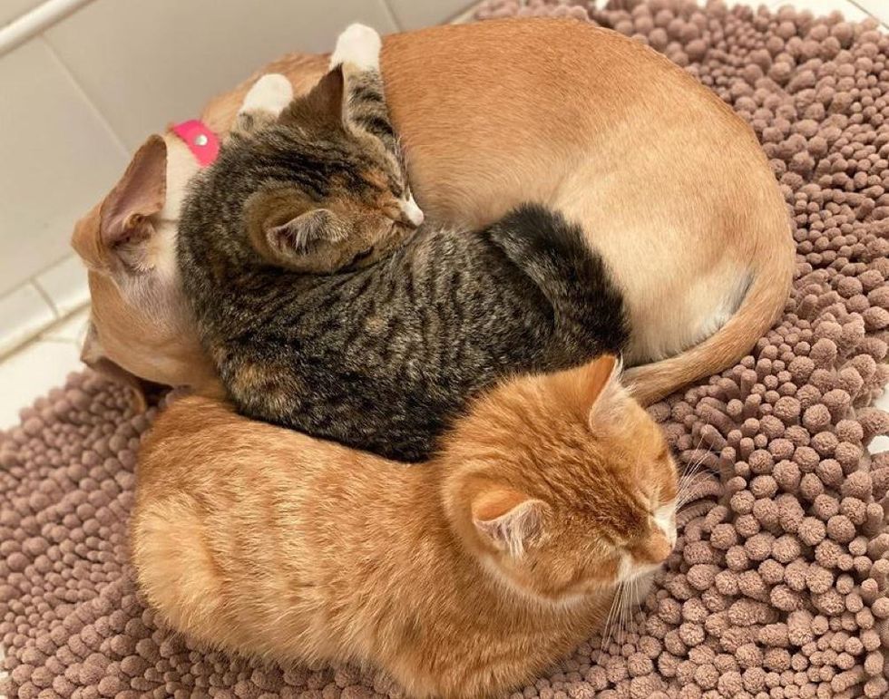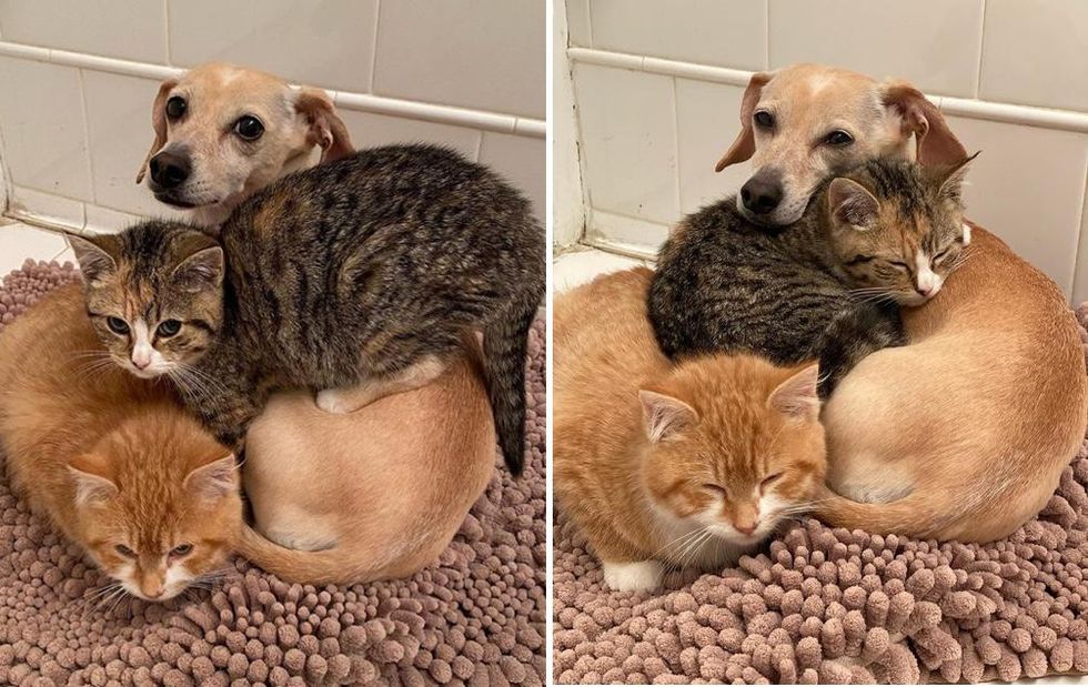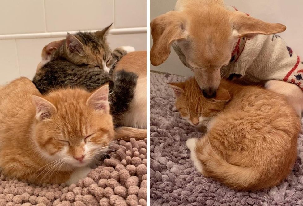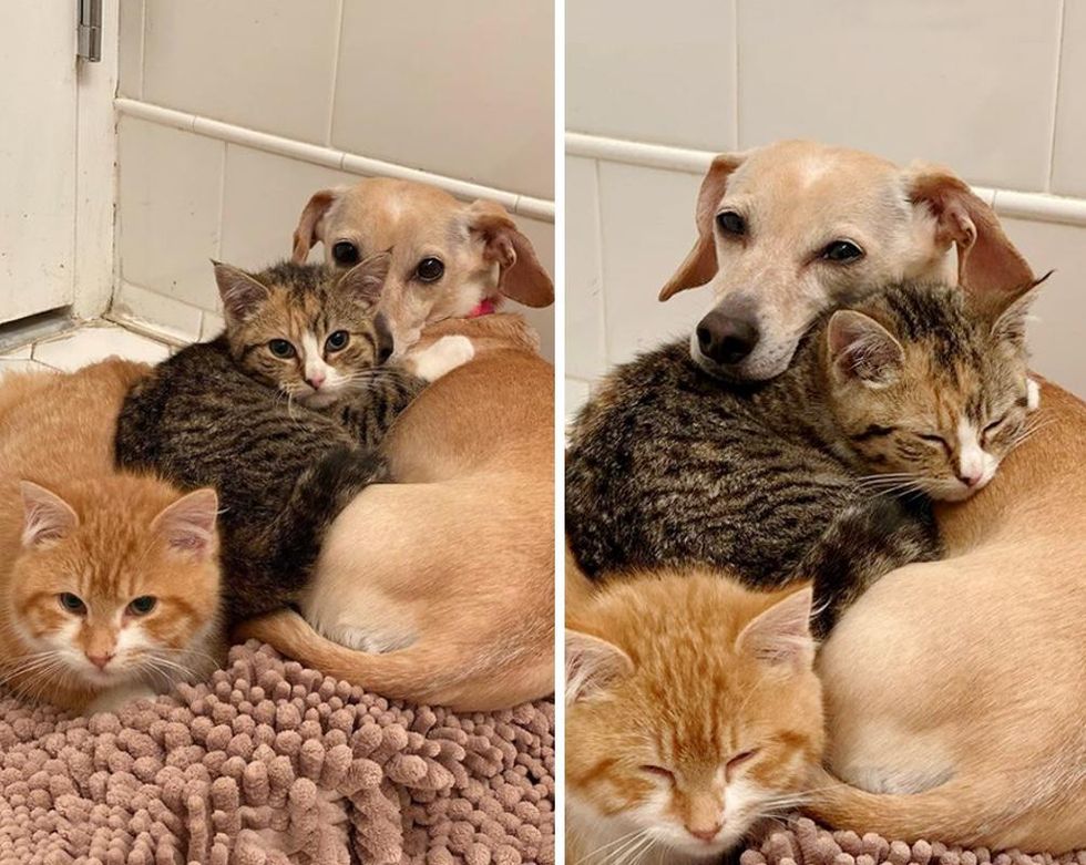 A sweet dog took a pair of shy kittens under her wing and showed them love and courage.