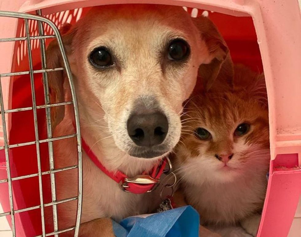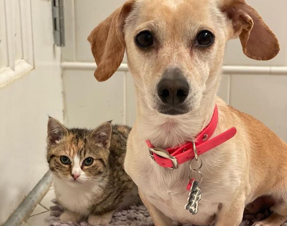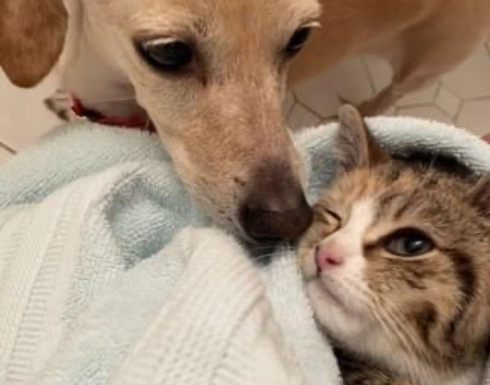 Kona pawed at the carrier and eagerly wanted to meet the new kitten. She followed Blair around and insisted on giving her a bath and snuggles. The timid little feline was quickly overcome by the tender loving care.