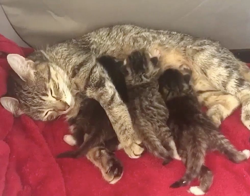 It was a difficult delivery for the young mom, but thanks to her caretakers who were there to aid her through the process, she gave birth to a littler of three healthy mini tabbies.