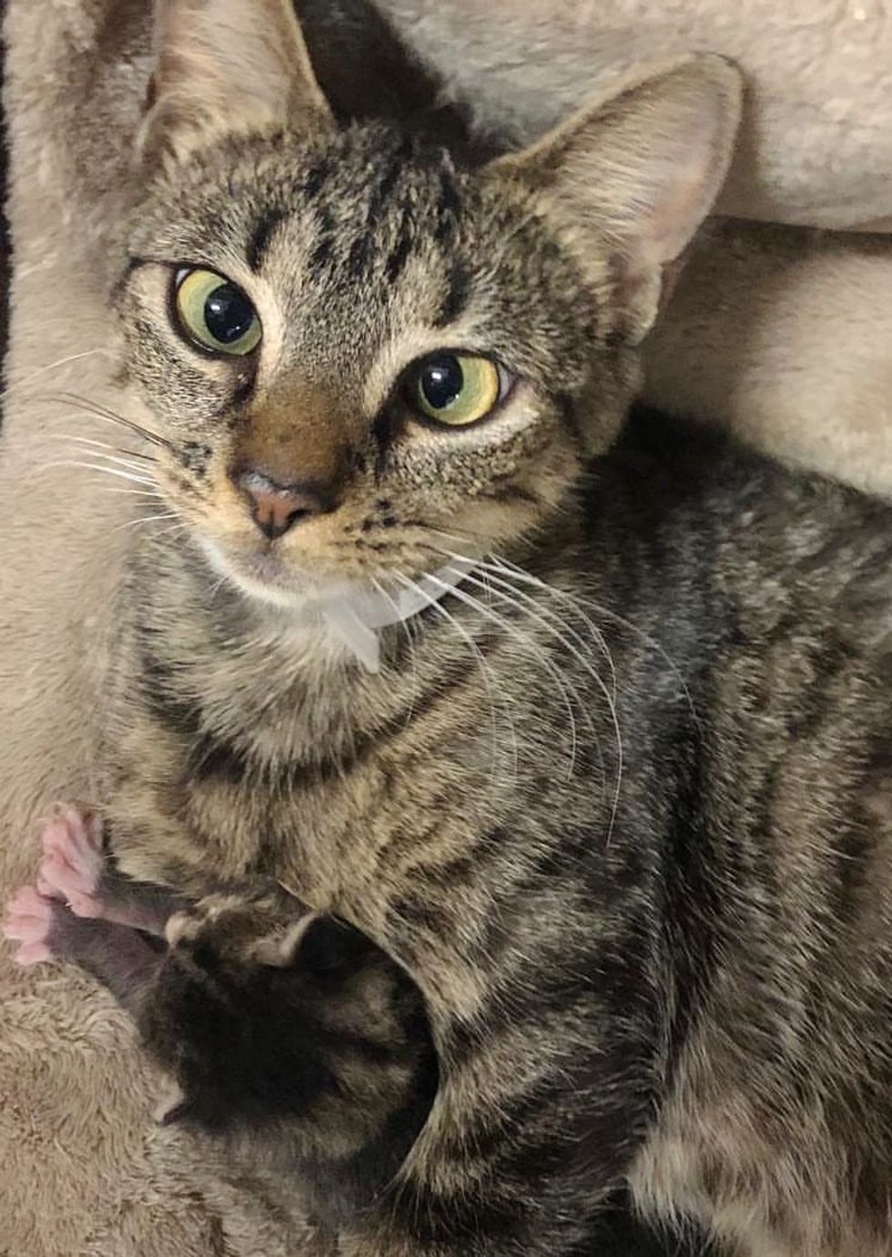 Since the moment she had her first kitten, she hasn't left their side, nursing, grooming and caring for them around the clock. "Mama Sugarplum is insanely cuddly and a very devoted mom."
