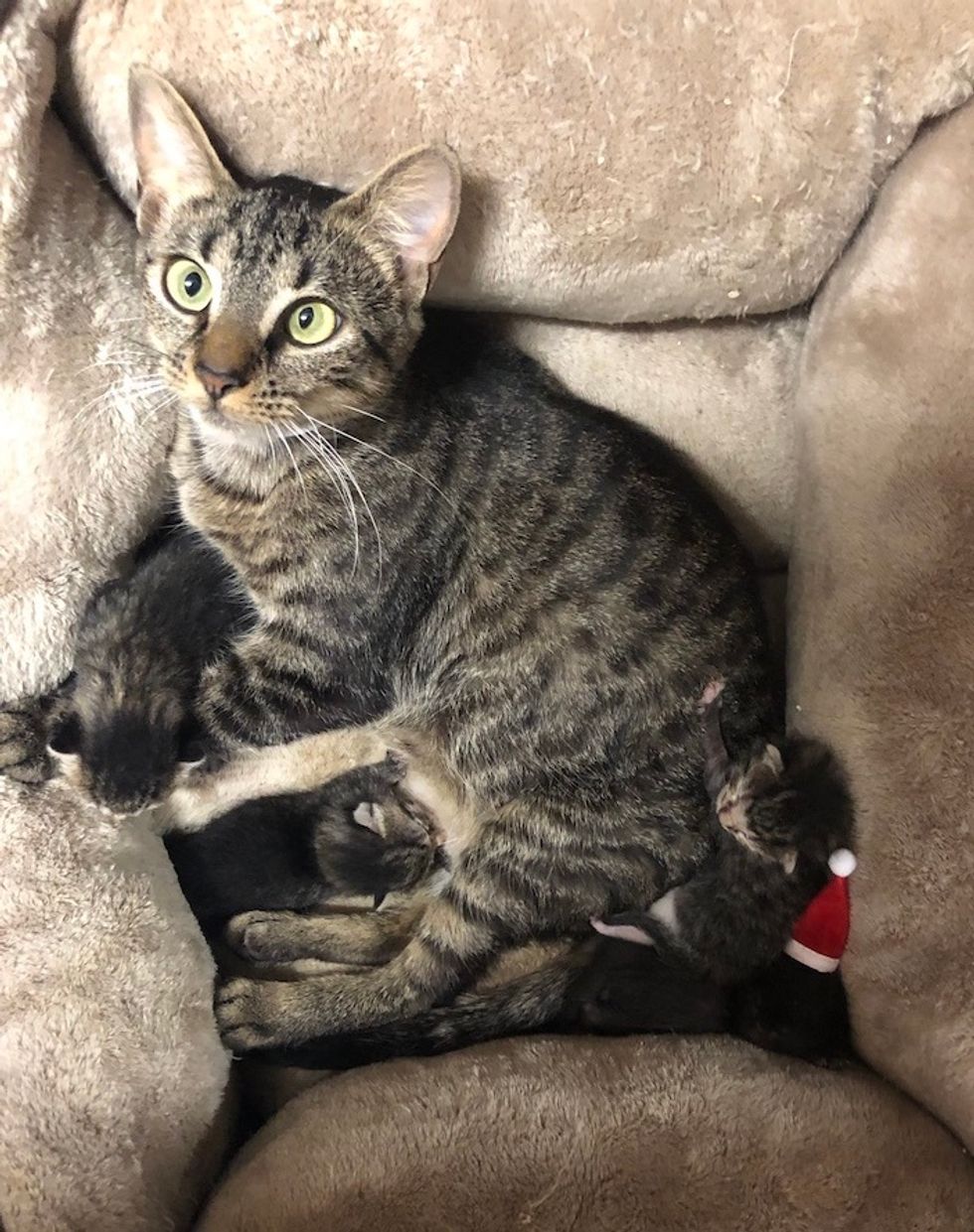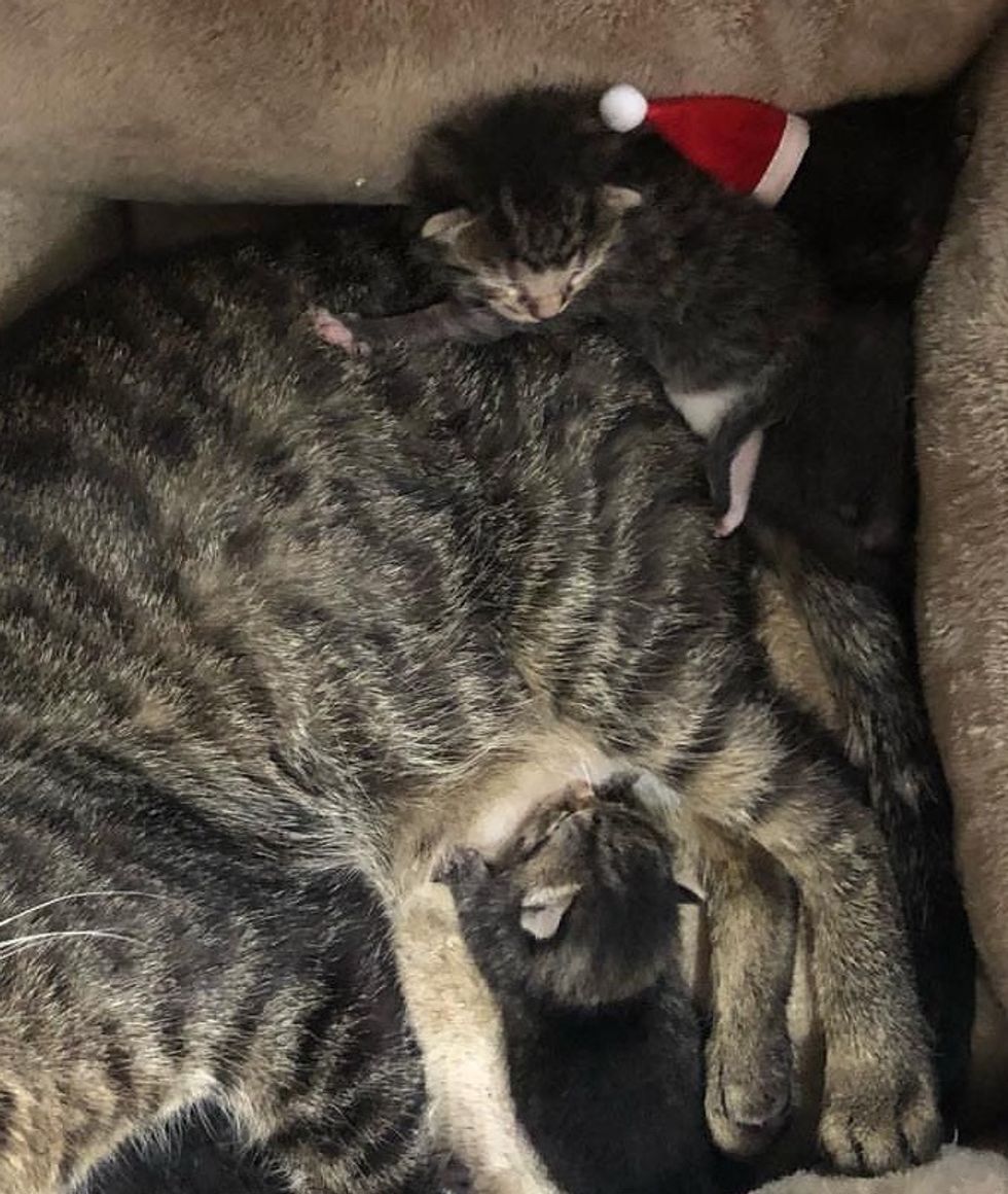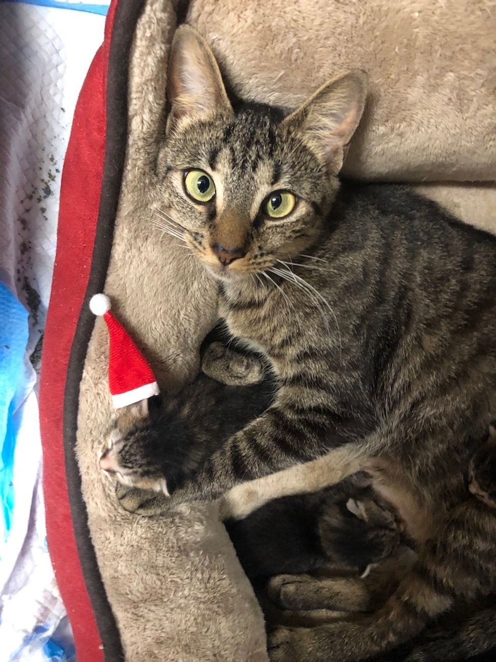 Knowing that the tabby cat would give birth any time soon, right before Christmas Eve, volunteers of Brooklyn Bridge Animal Welfare Coalition (BBAWC) pulled her from the city shelter so she and her kittens could get a chance at a better life.