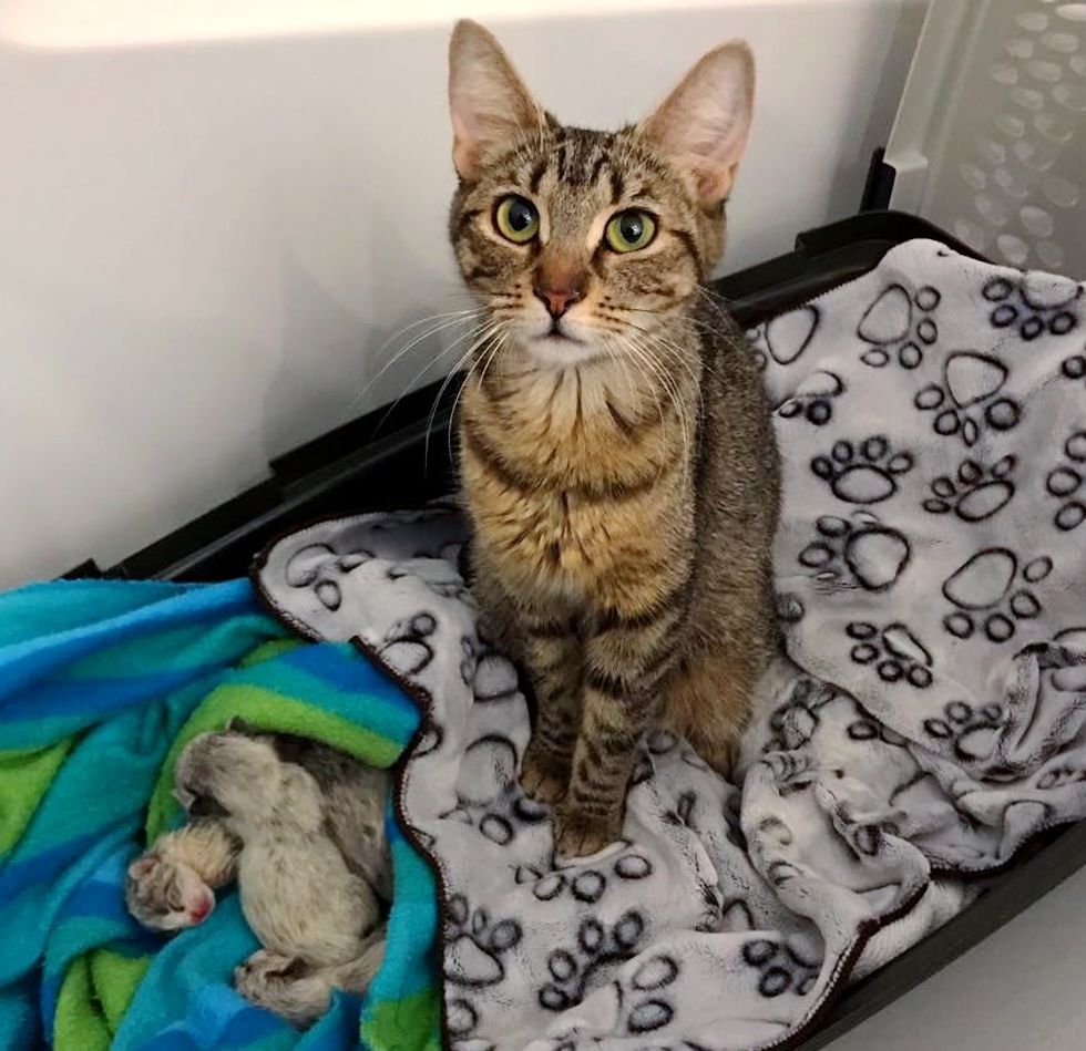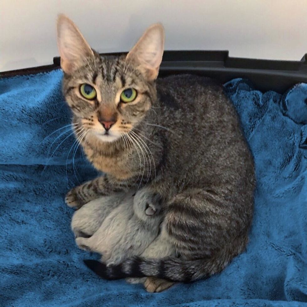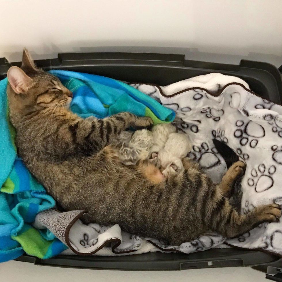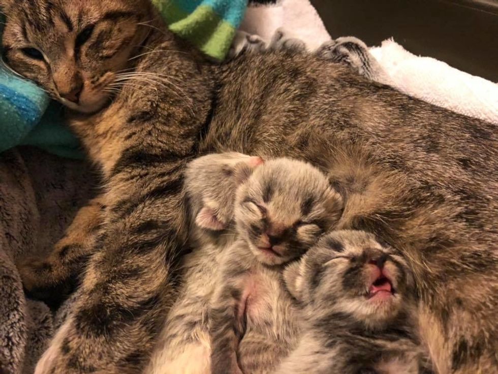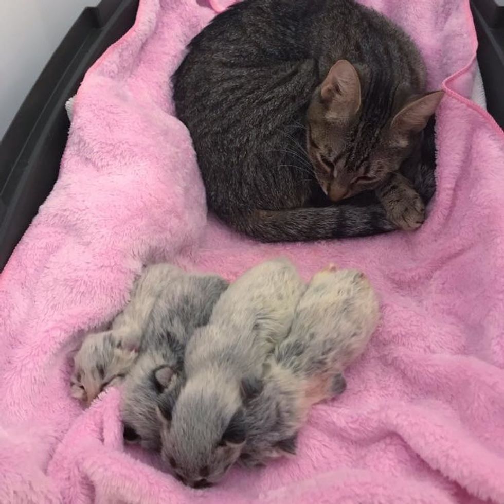A young cat mom and her newborn kittens found themselves at a shelter, in need of help.