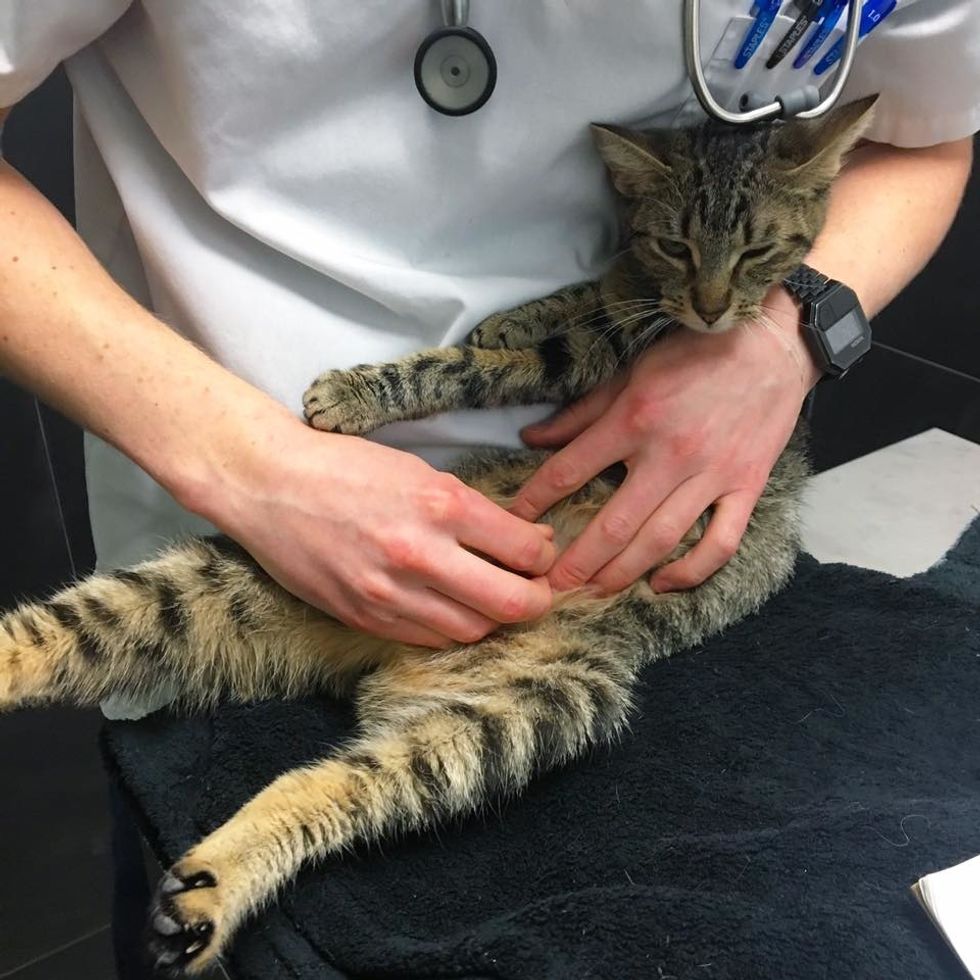 The kittens were underweight at between 86 grams and 110 grams. They were born with a fever coat, an indication that the mother cat had been ill with a fever or stress during pregnancy.